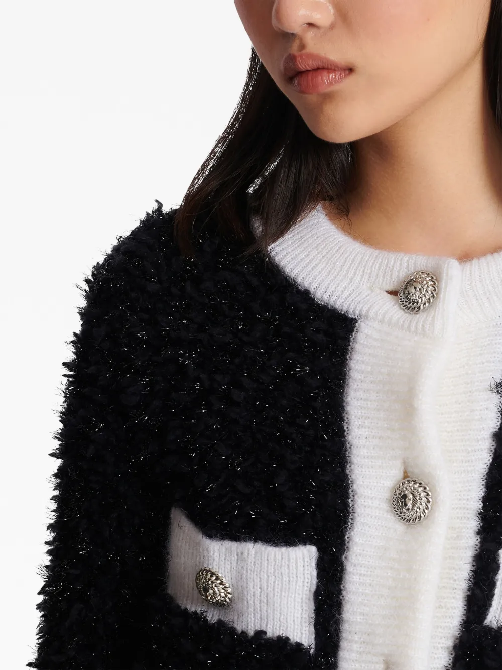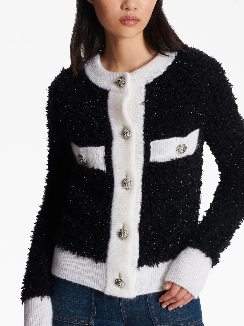 Черный/белый, ткань букле, трикотажный материал, блестящий материал, контрастная отделка, отделка в рубчик, круглый вырез, застежка на пуговицах спереди, длинные рукава, нагрудный карман на двух пуговицах и прямой подол.