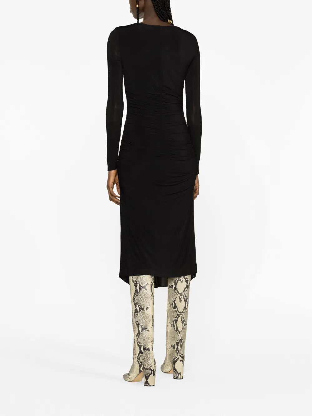 Черный, стрейчевая ткань, детали с оборками, V-образный вырез, длинные рукава и длина миди.