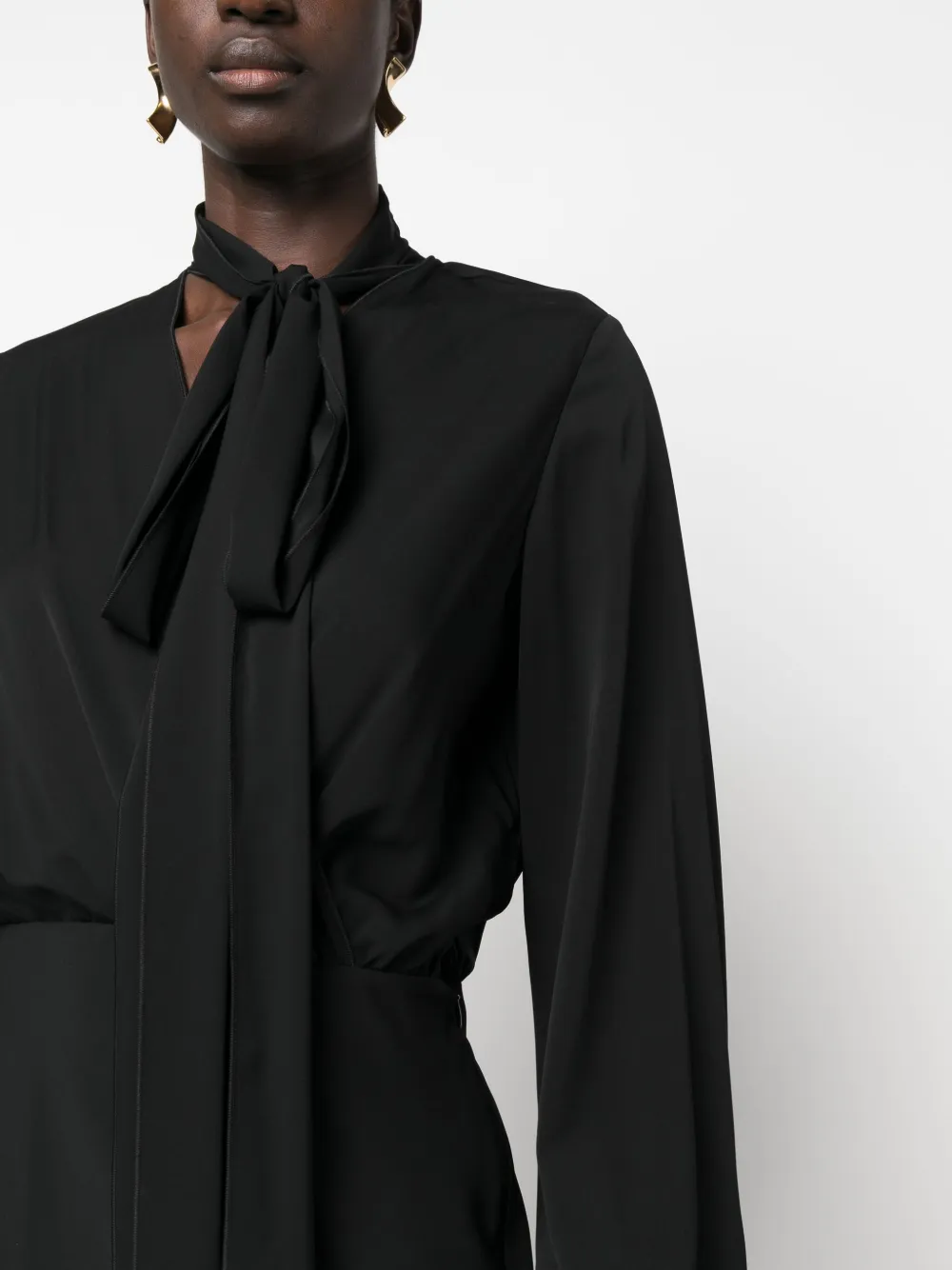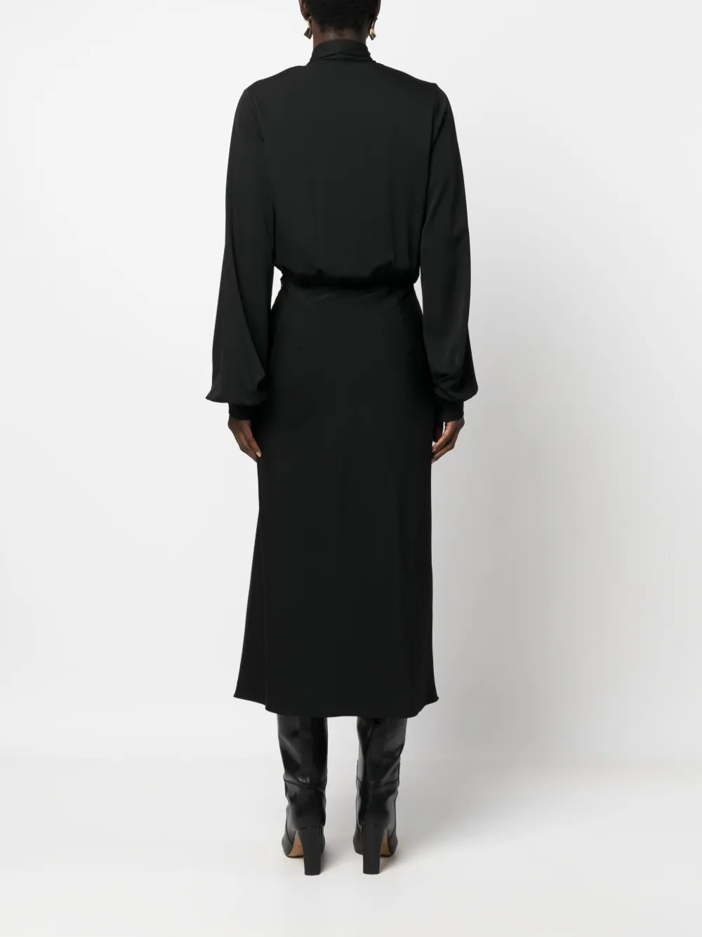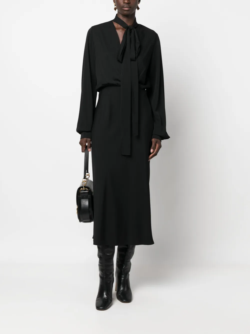 Черный, эластичный шелк, несъемный шарф, V-образный вырез, длинные рукава, длина миди и расклешенный подол.