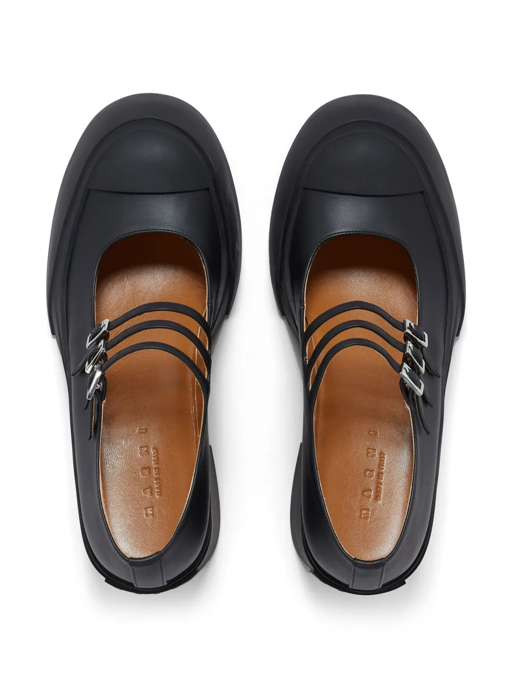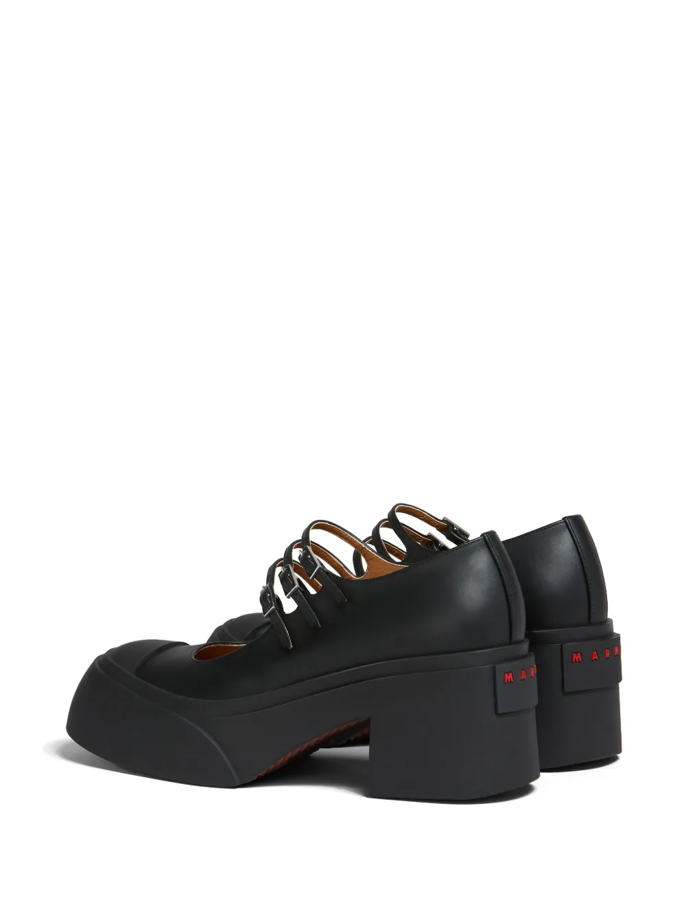 Черный, телячья кожа, гладкая текстура кожи, тисненый логотип сзади, закругленный носок, застежка на пряжке и ремешке, блочный каблук средней высоты и подошва на платформе.