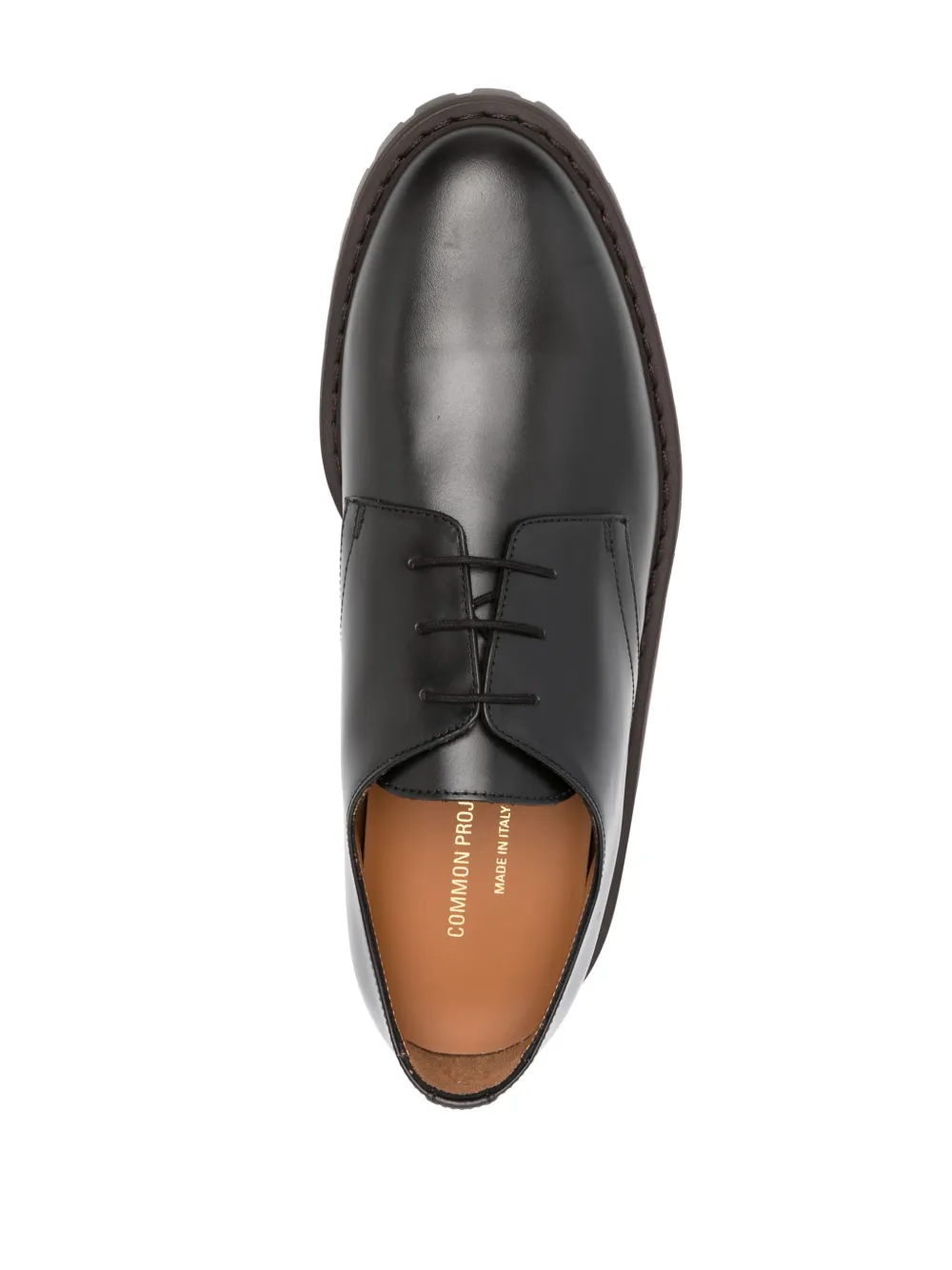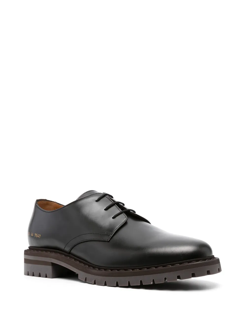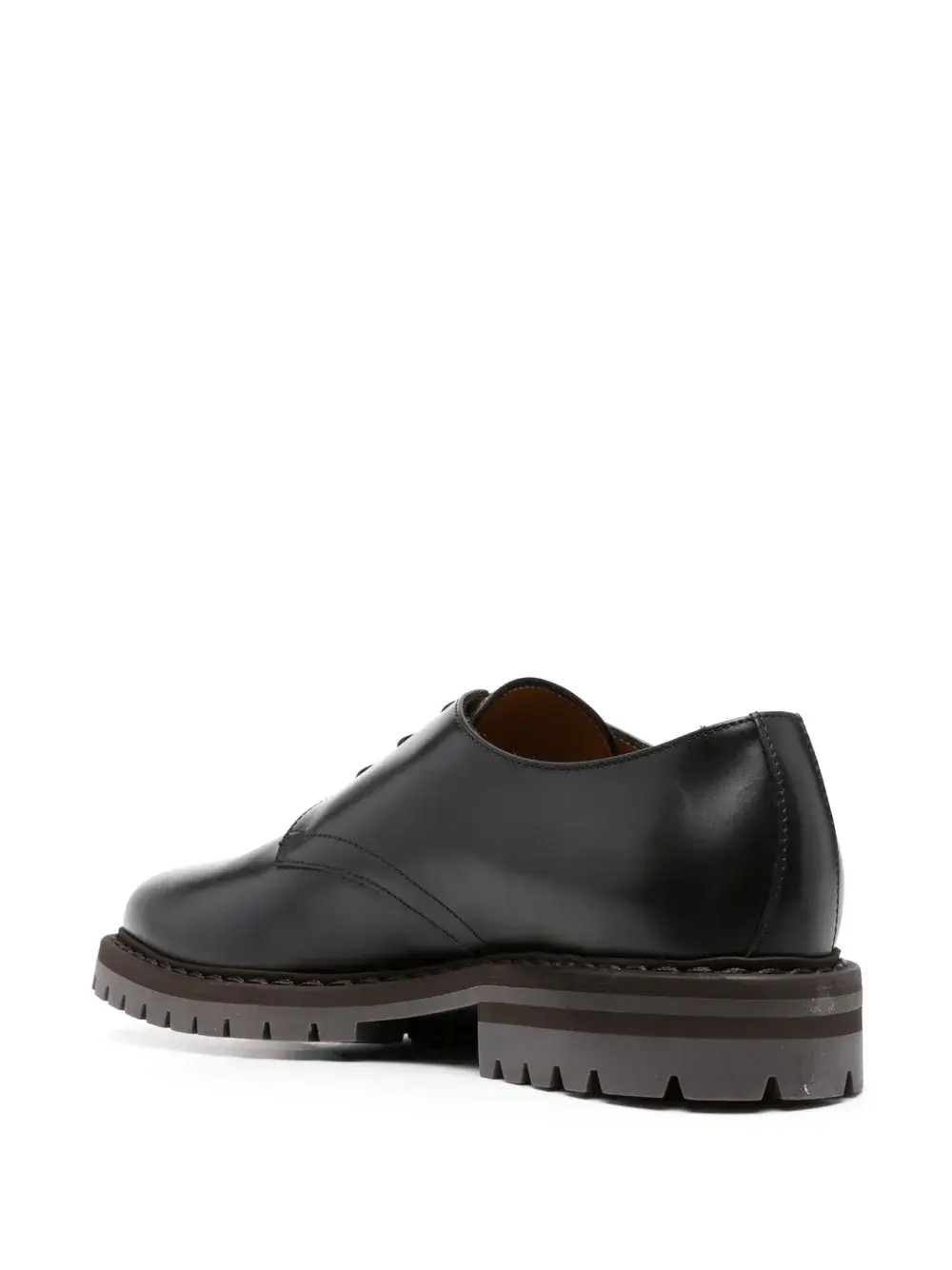 Черный, телячья кожа, принт с изображением серийного номера на каблуке, закругленный носок, шнуровка спереди, кожаная стелька с логотипом и рифленая резиновая подошва.