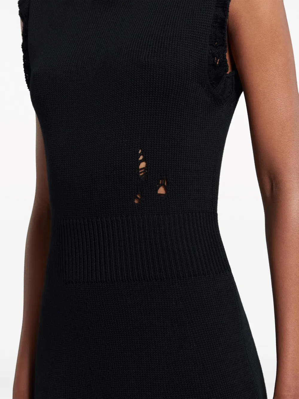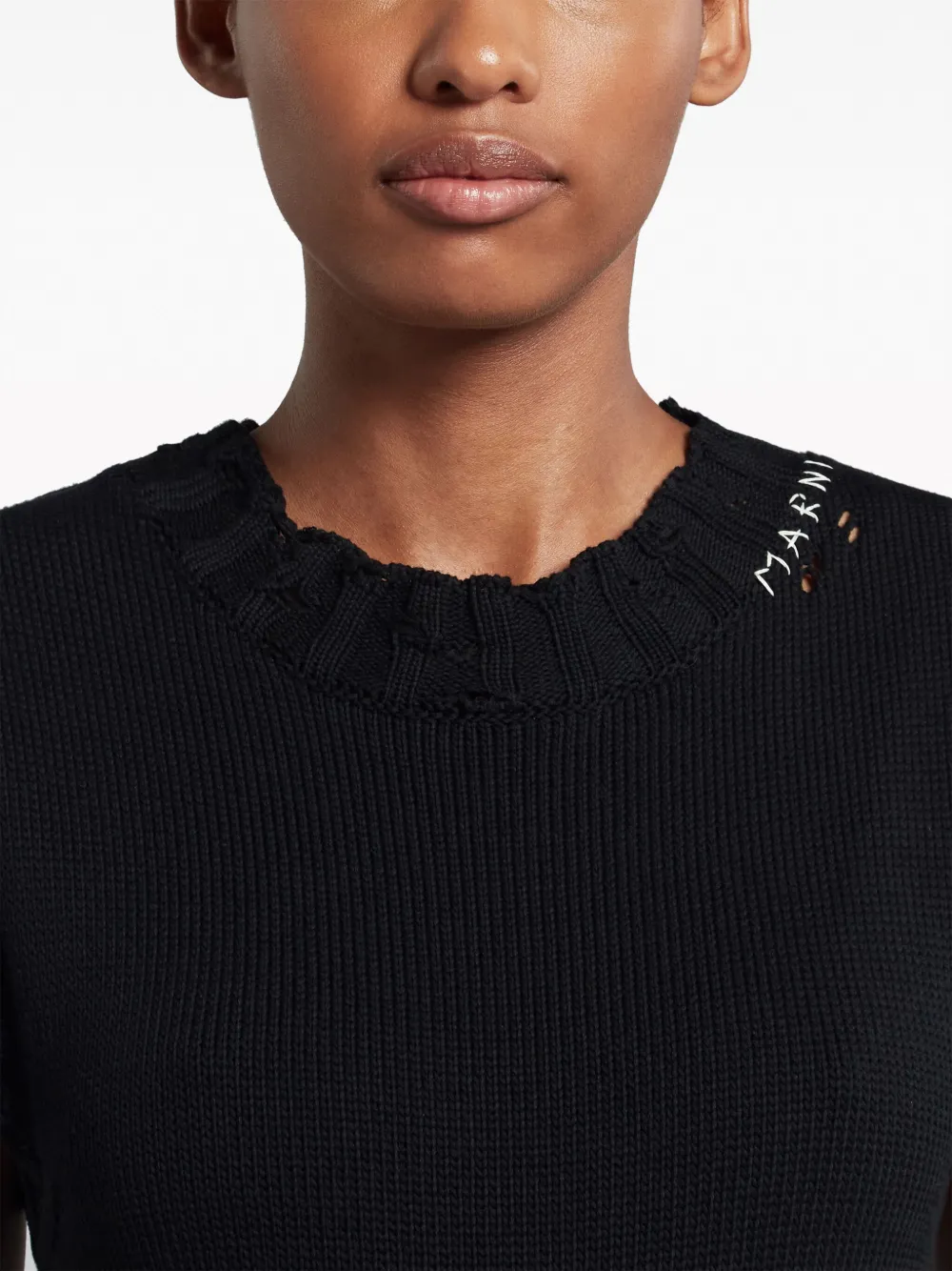 Черный, хлопок, трикотажный материал, эффект потертости, воротник с вышитым логотипом, круглый вырез, без рукавов и подол в рубчик.