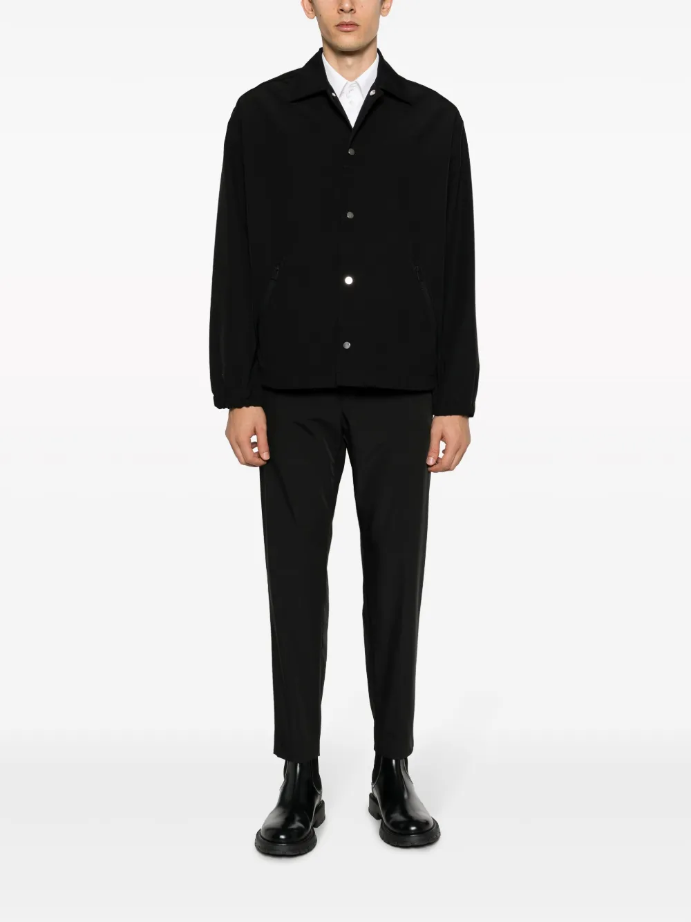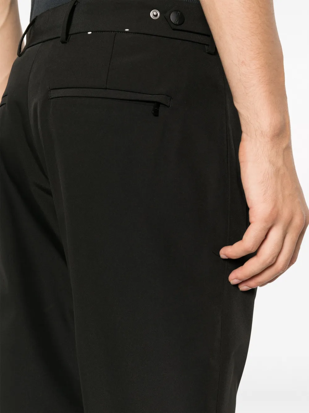 Черный, петли для ремня, застежка на пуговицах спереди, два вшитых кармана по бокам, регулируемый ремень на талию, два кармана с листочкой сзади и прямой крой.