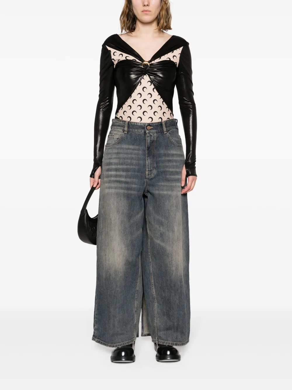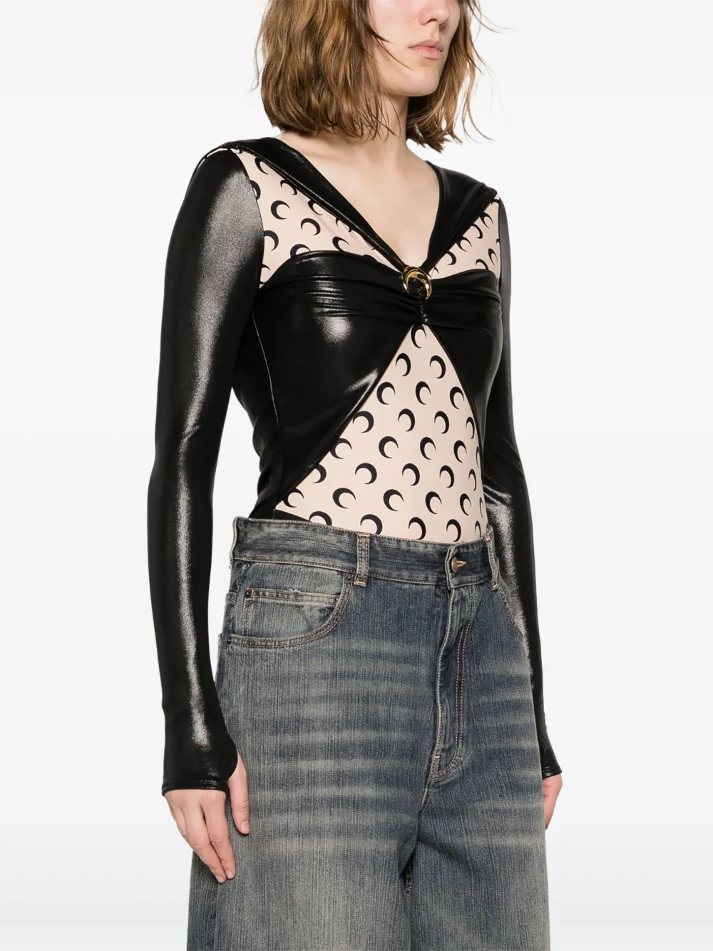 Подробнее о товаре: • черный • бежевый • эластичная ткань • ламинированное покрытие • принт с изображением полумесяца • дизайн со вставками • детали с оборками • декор с изображением полумесяца • V-образный вырез • потайная застежка на кнопках • длинные рукава • V-образный вырез • высокий вырез • цельная подкладка • Эту вещь можно примерить, но только поверх собственного белья.