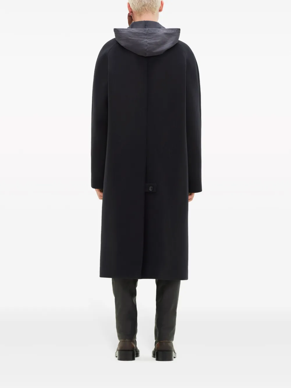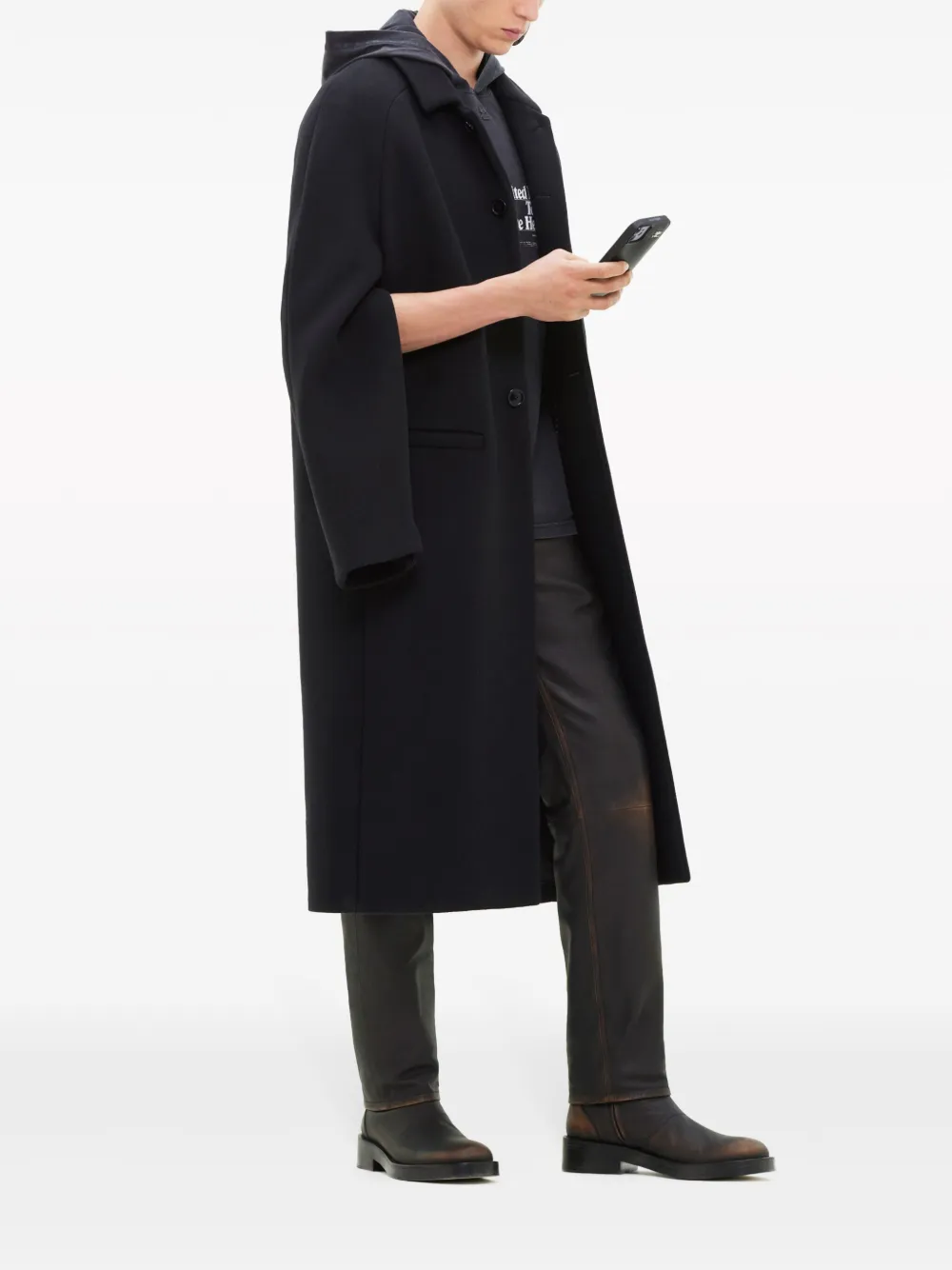 Черный, смесовая шерсть, зазубренные лацканы, застежка на пуговицах спереди, длинные рукава, манжеты на молнии, прямой подол и длинная модель.