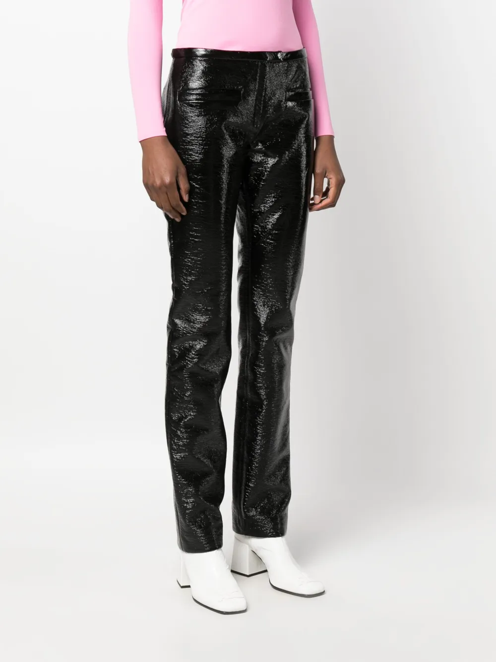Черный, смесовый хлопок, купро Bemberg, лакированная отделка, жатый эффект, низкая посадка, облегающий крой, прямой крой, два передних кармана с листочкой и задние карманы с листочкой.