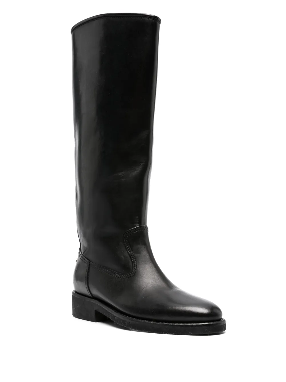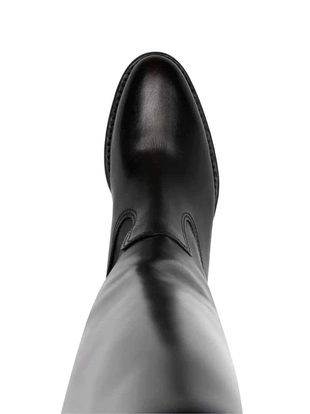 Черный, телячья кожа, гладкая текстура кожи, глянцевая фактура, миндалевидный носок, длина по колено и низкий блочный каблук.