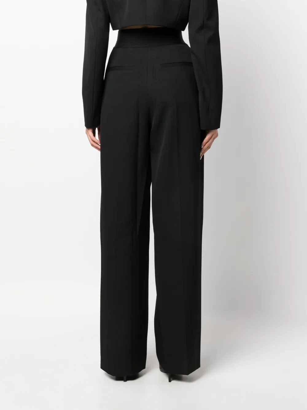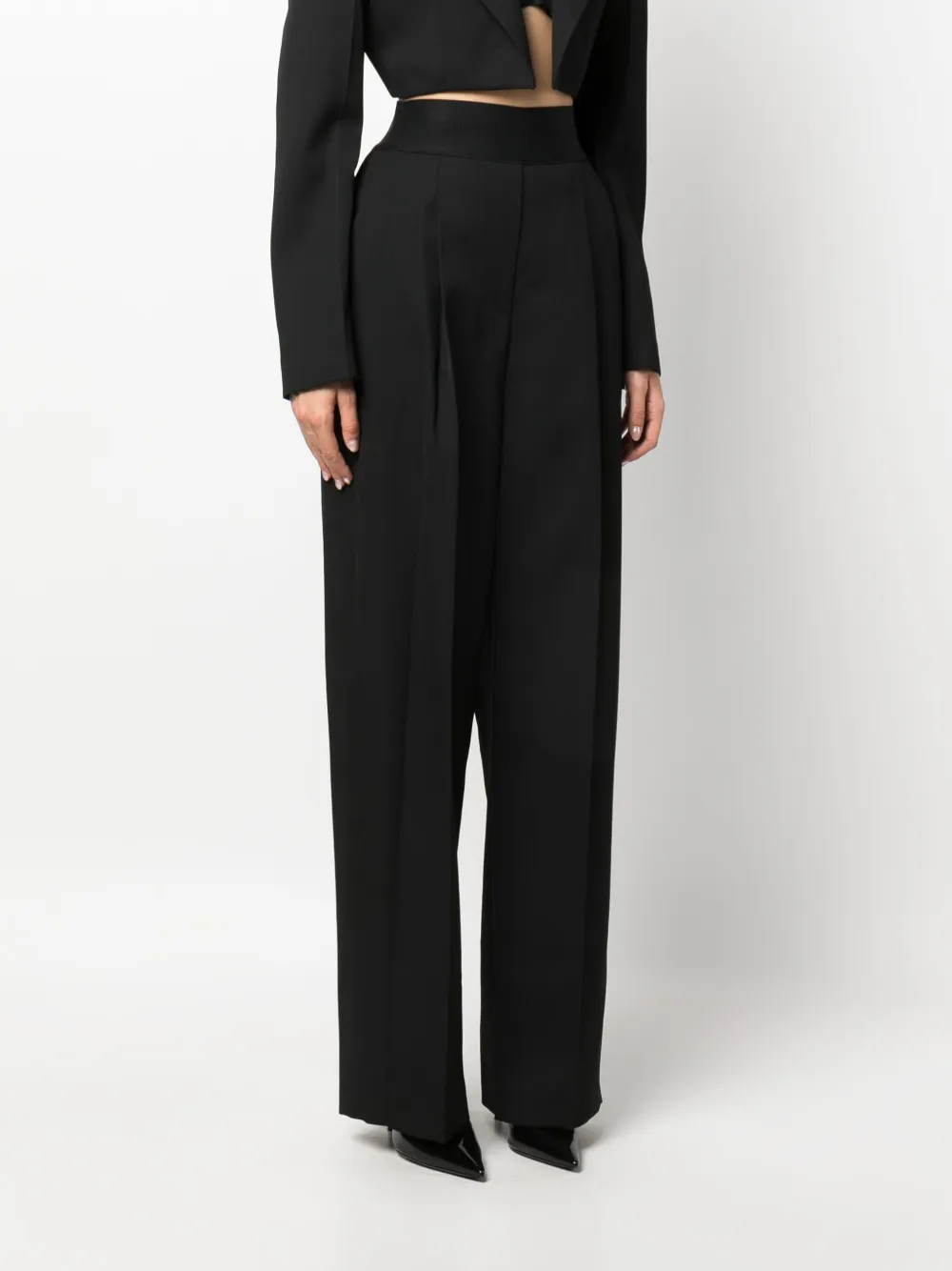 Черный, шерсть, классический крой, завышенная талия, складки, эластичный пояс, прямой крой, два вшитых кармана по бокам, два кармана с листочкой сзади и длинная модель.