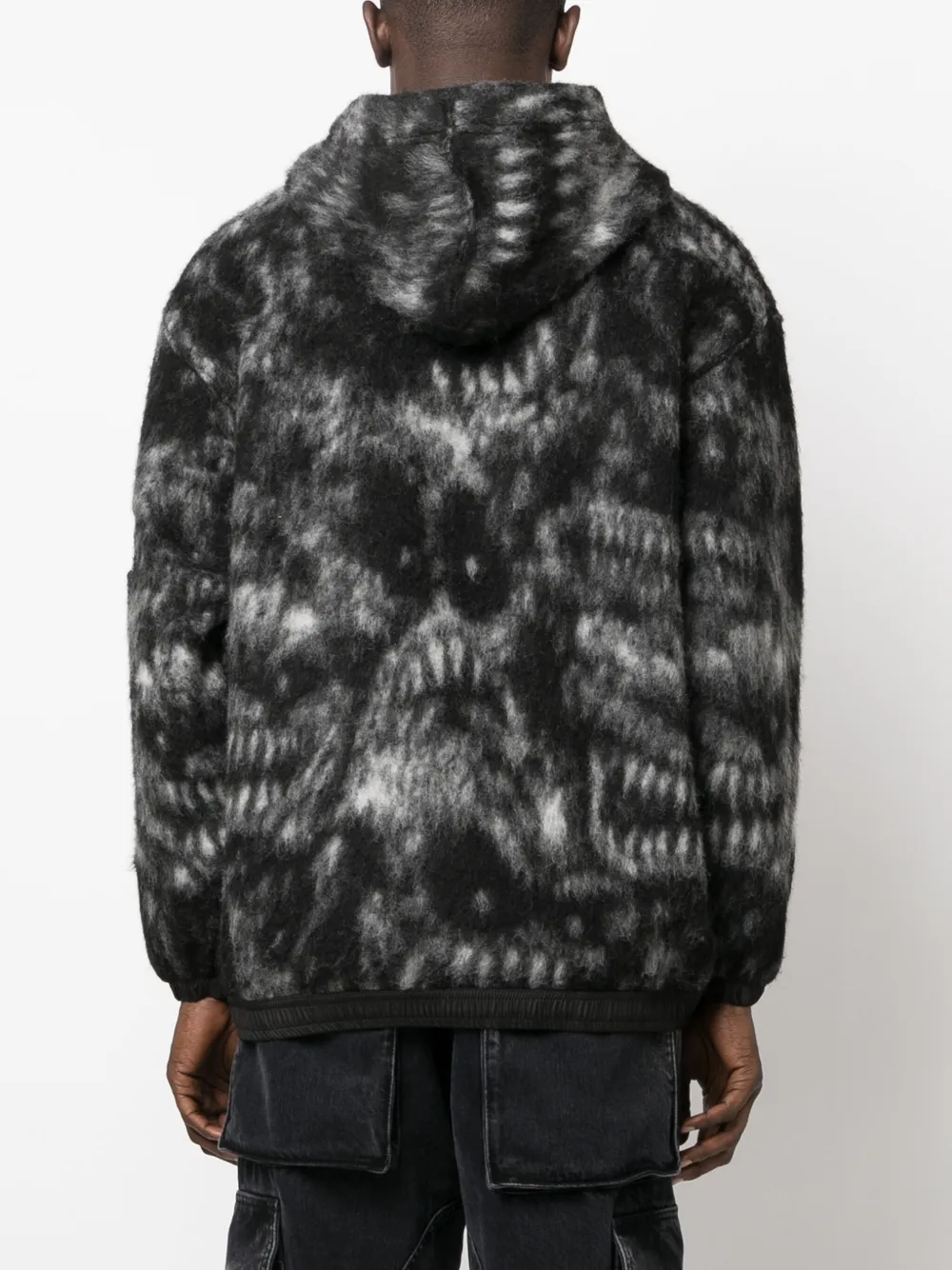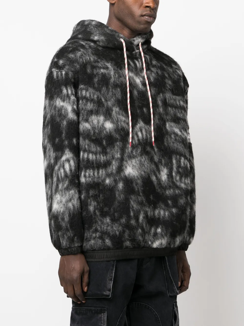 Строчка в тон, абстрактный принт, нашивка с логотипом на рукаве, затягивающийся на шнурок капюшон, приспущенные плечи, длинные рукава, эластичные манжеты и эластичный подол.