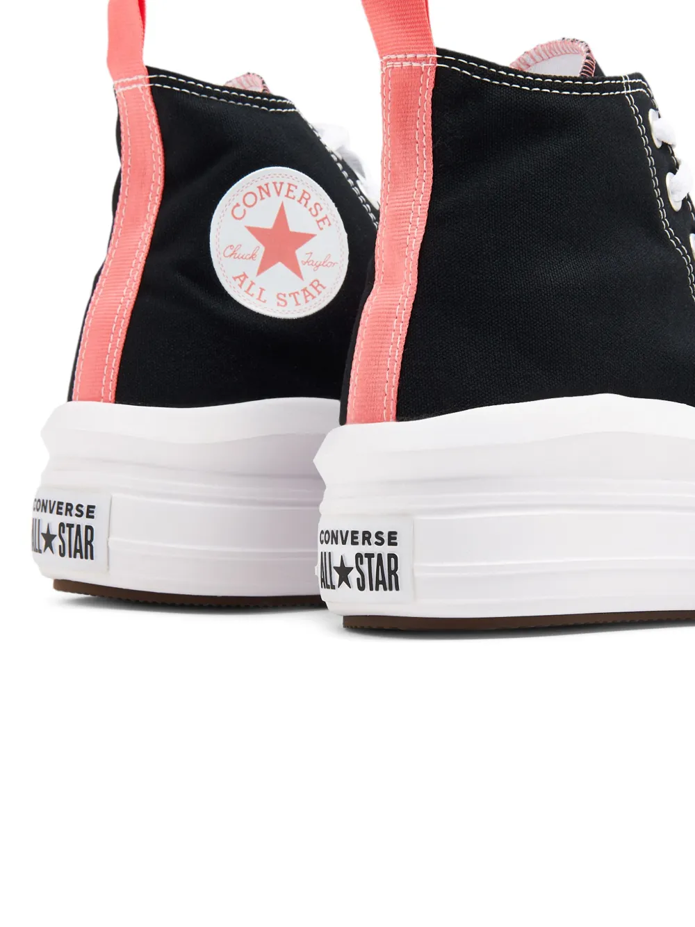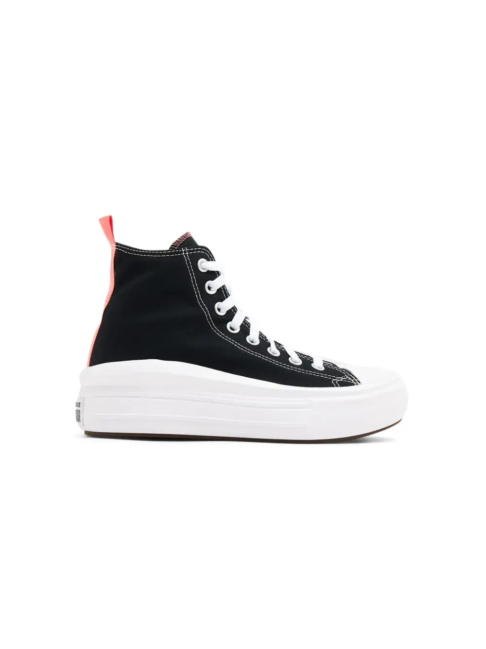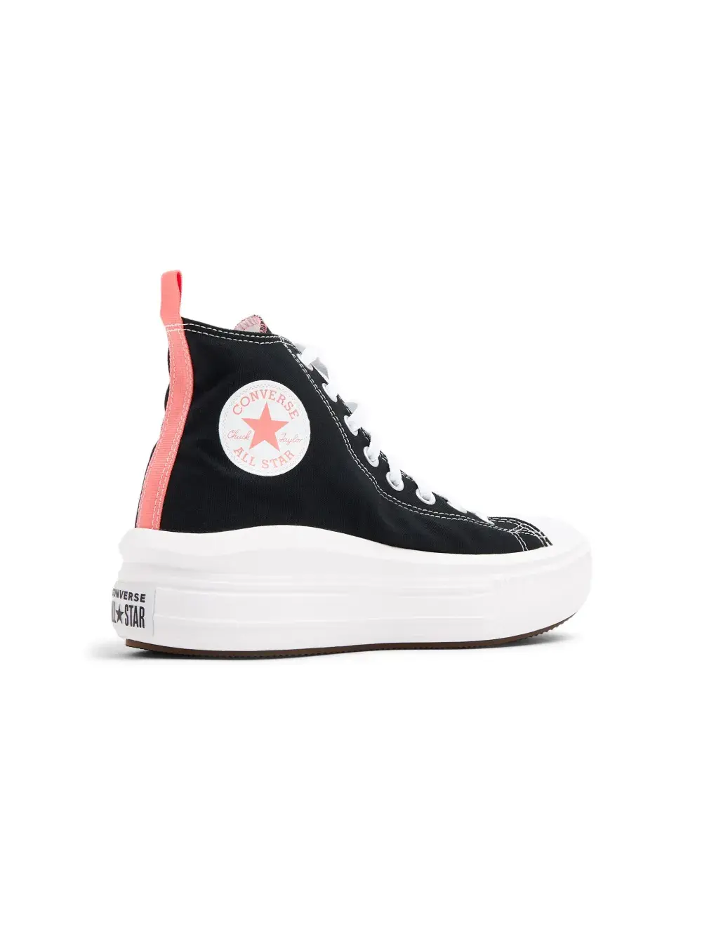 Черный, кораллово-розовый, серовато-белый, парусина, нашивка с логотипом сзади, нашивка с логотипом сбоку, контрастная строчка, петля для подтягивания сзади, закругленный носок, шнуровка спереди, стелька с логотипом и массивная резиновая подошва.