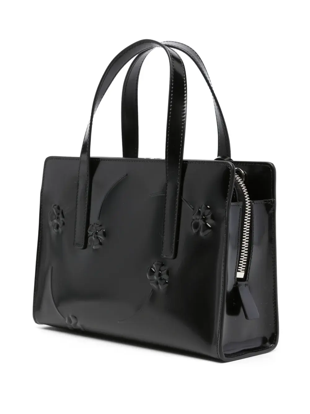 Лакированная отделка, цветочный узор, серебристый логотип, нашивка с логотипом внутри, крепление для ключей, две плоские верхние ручки, застежка на молнии сверху, несколько отделений, съемный регулируемый ремень на плечо и жаккардовая подкладка с логотипом.