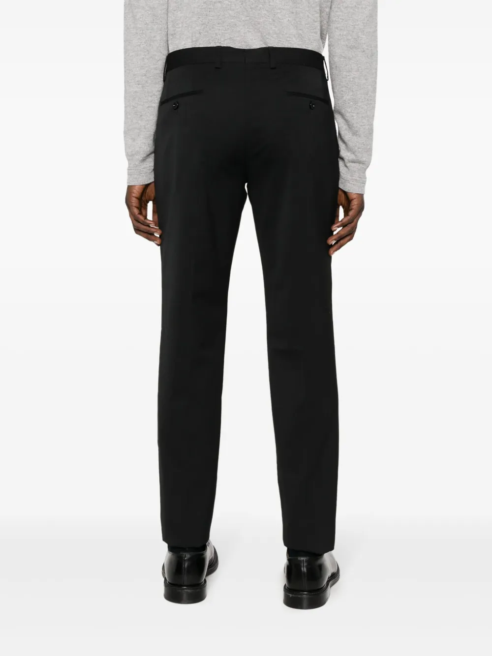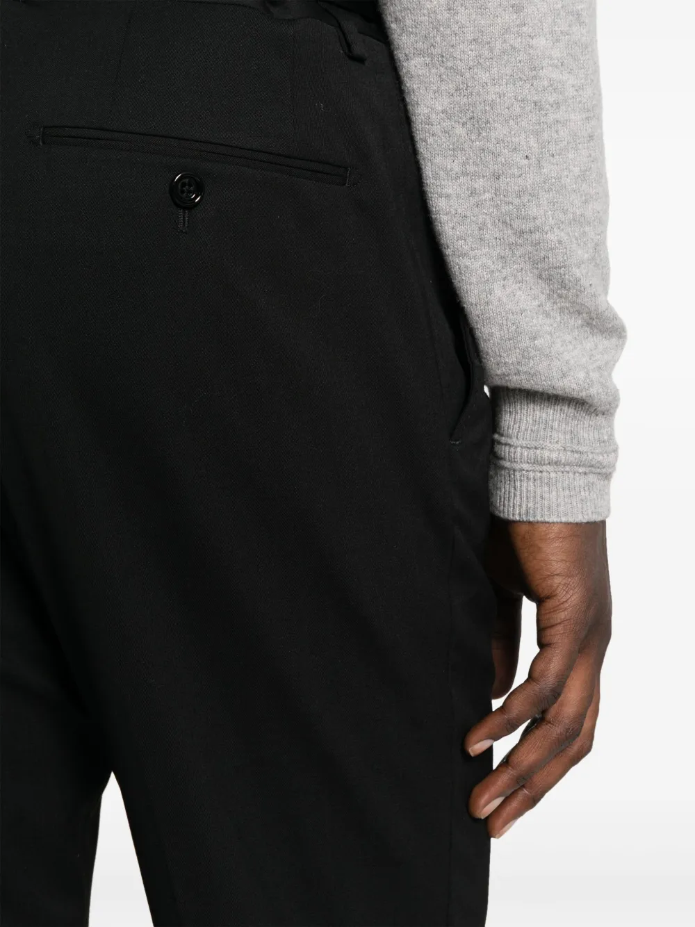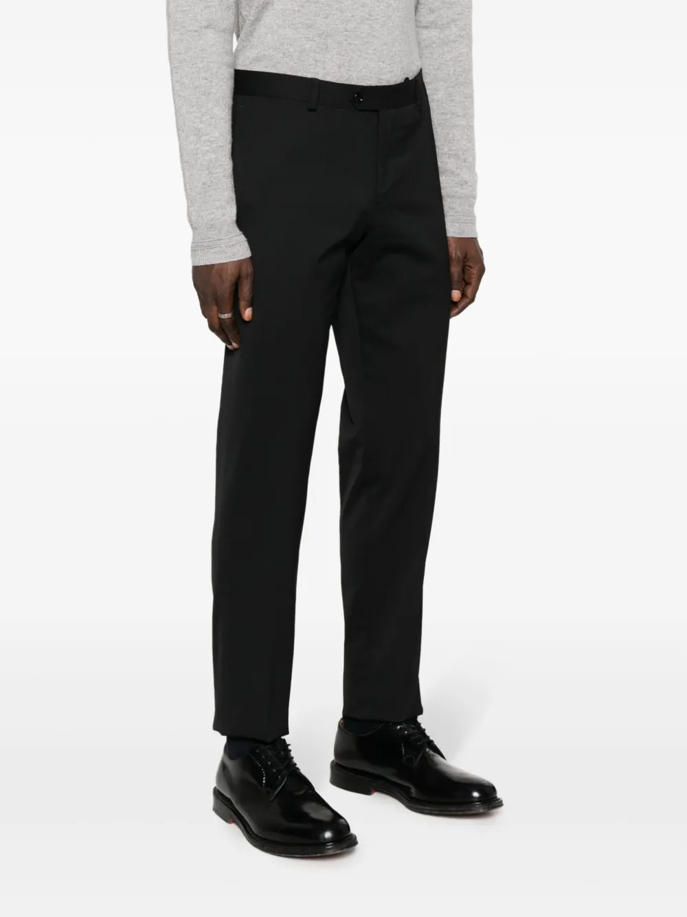 Черный, классический крой, петли для ремня, средняя посадка, узкий крой, смещенная застежка на пуговицах спереди, два вшитых кармана по бокам и два прорезных кармана на пуговицах сзади.