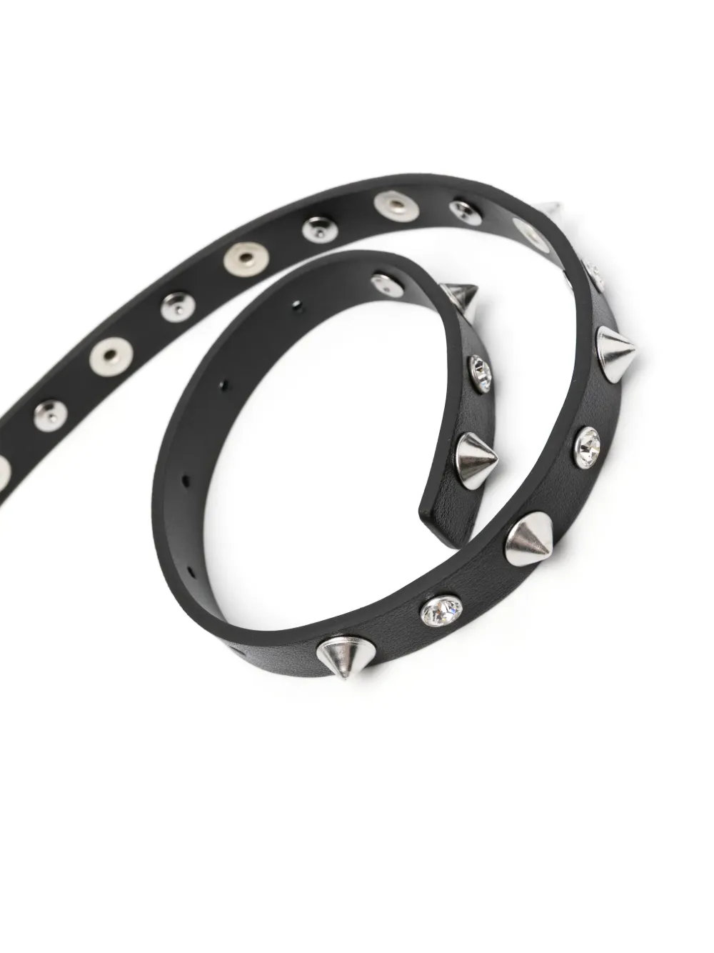 Черный, телячья кожа, заклепки-шипы, застежка с пряжкой спереди и серебристая фурнитура.