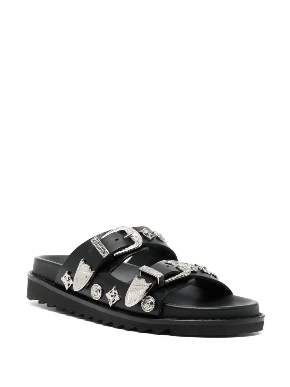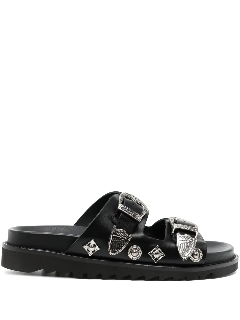 Черный, телячья кожа, серебристая фурнитура, заклепки, два ремешка с застежкой на пряжке, открытый носок, закругленный носок, формованная стелька, стелька с логотипом и плоская резиновая подошва.
