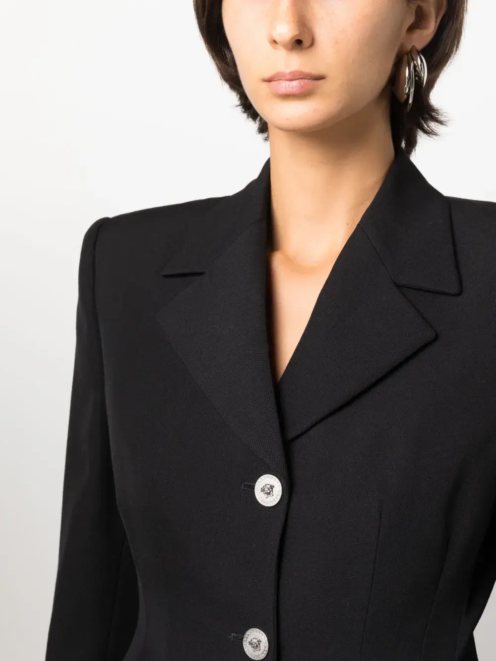 Черный, необработанная шерсть, узор Medusa Head, серебристые пуговицы с тиснением, бирка с логотипом, зазубренные лацканы, застежка на пуговицах спереди, длинные рукава, манжеты на пуговицах, два передних кармана с клапанами, шлица по центру сзади и прямой подол.