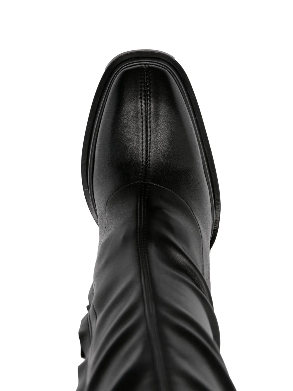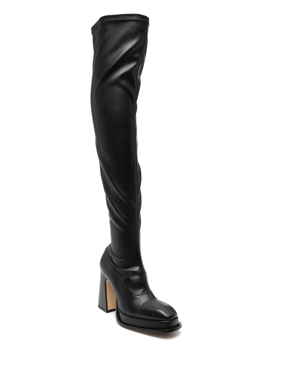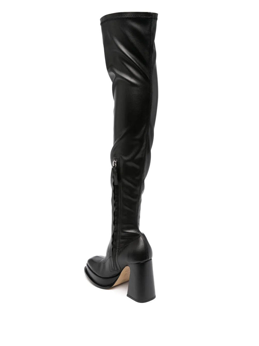 Черный, телячья кожа, закругленный носок, застежка на молнии сбоку, длина по колено и высокий блочный каблук.