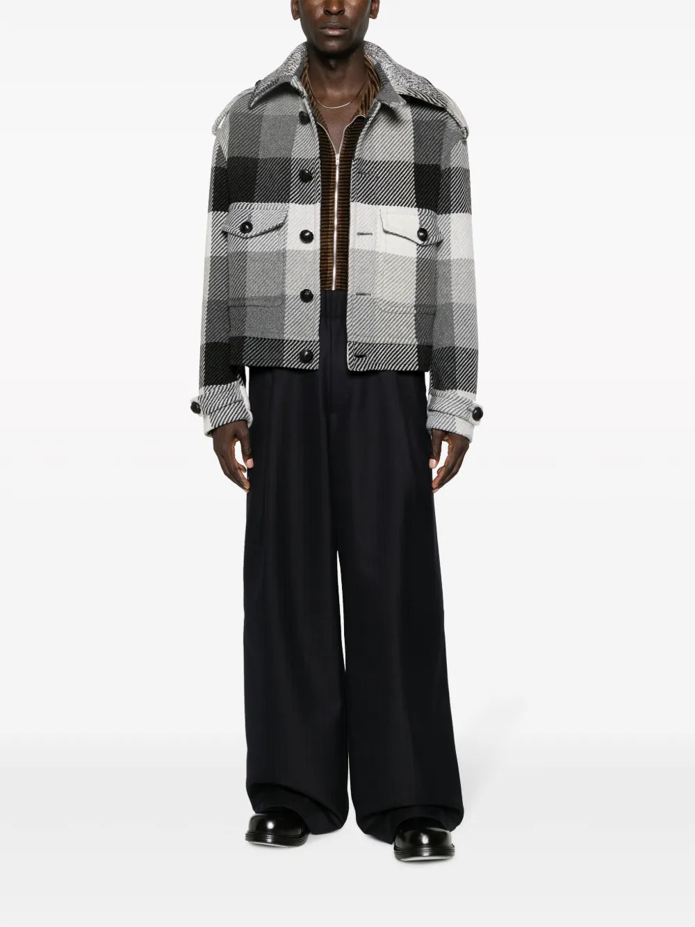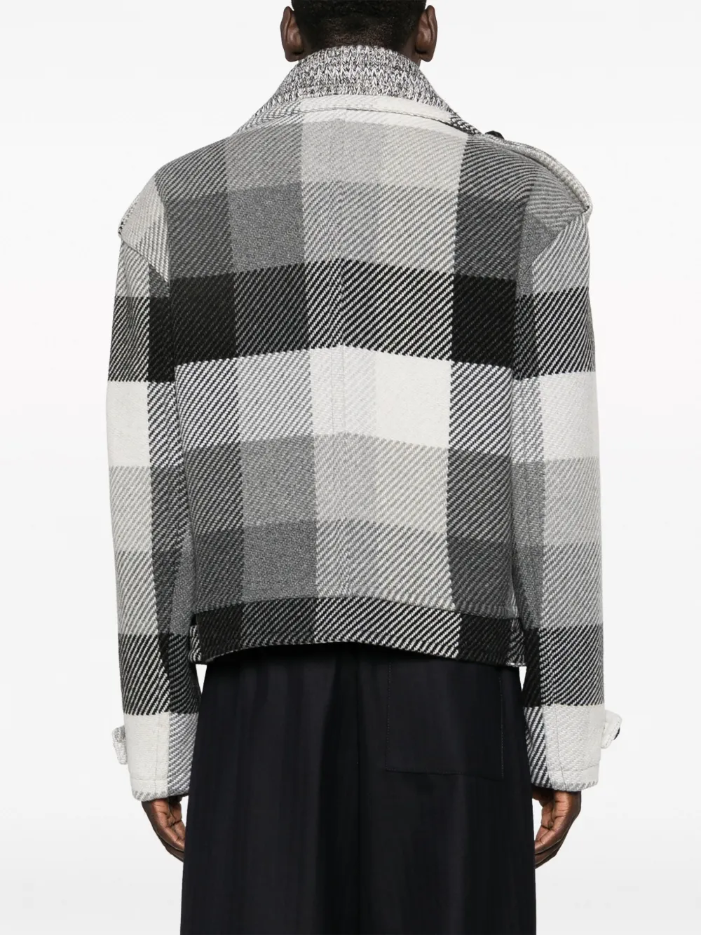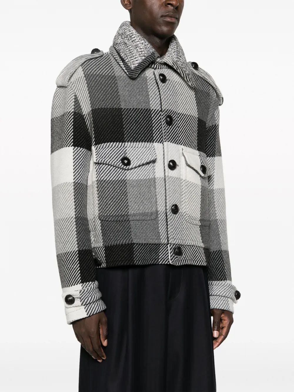 Антрацитово-серый, угольно-серый, кремово-белый, смесовая шерсть, ткань с твиловым переплетением, клетчатый узор, плоский заостренный воротник, застежка на пуговицах спереди, пуговичные застежки на плечах, приспущенные плечи, длинные рукава, манжеты с ремешками, два передних кармана с клапанами и прямой подол.