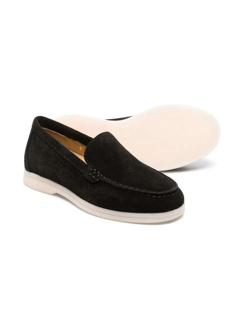 Черный, замша из телячьей кожи, строчка в тон, без эффекта утяжеления, закругленный носок, модель без застежки, кожаная стелька с логотипом, плоская резиновая подошва и низкий блочный каблук. Все товары произведены вручную.