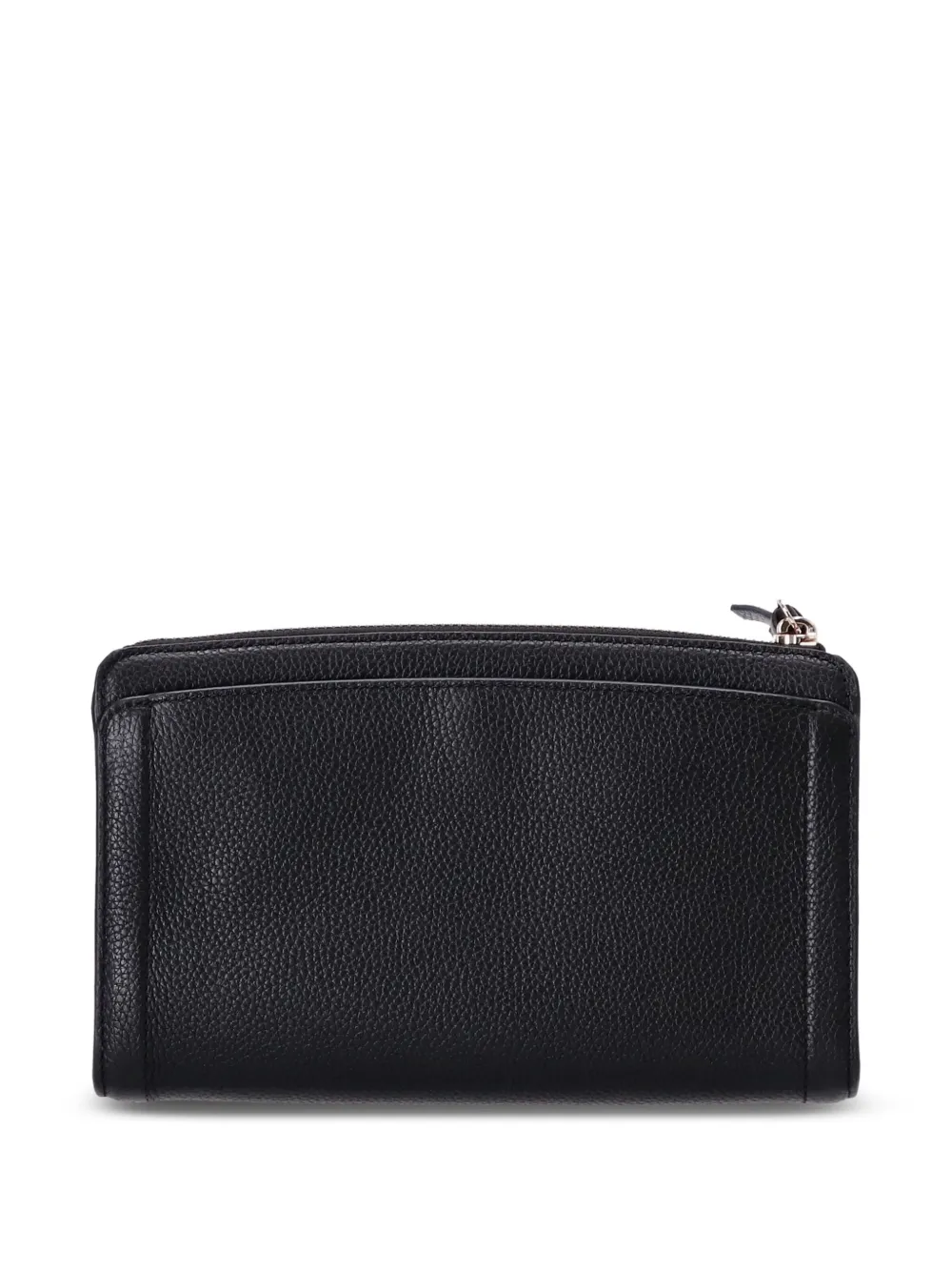 Черный, телячья кожа, зернистая текстура, золотистый логотип, золотистая фурнитура, застежка на молнии сверху, съемный регулируемый ремень на плечо, основное отделение, нашивка с логотипом внутри и внутренний карман на молнии.