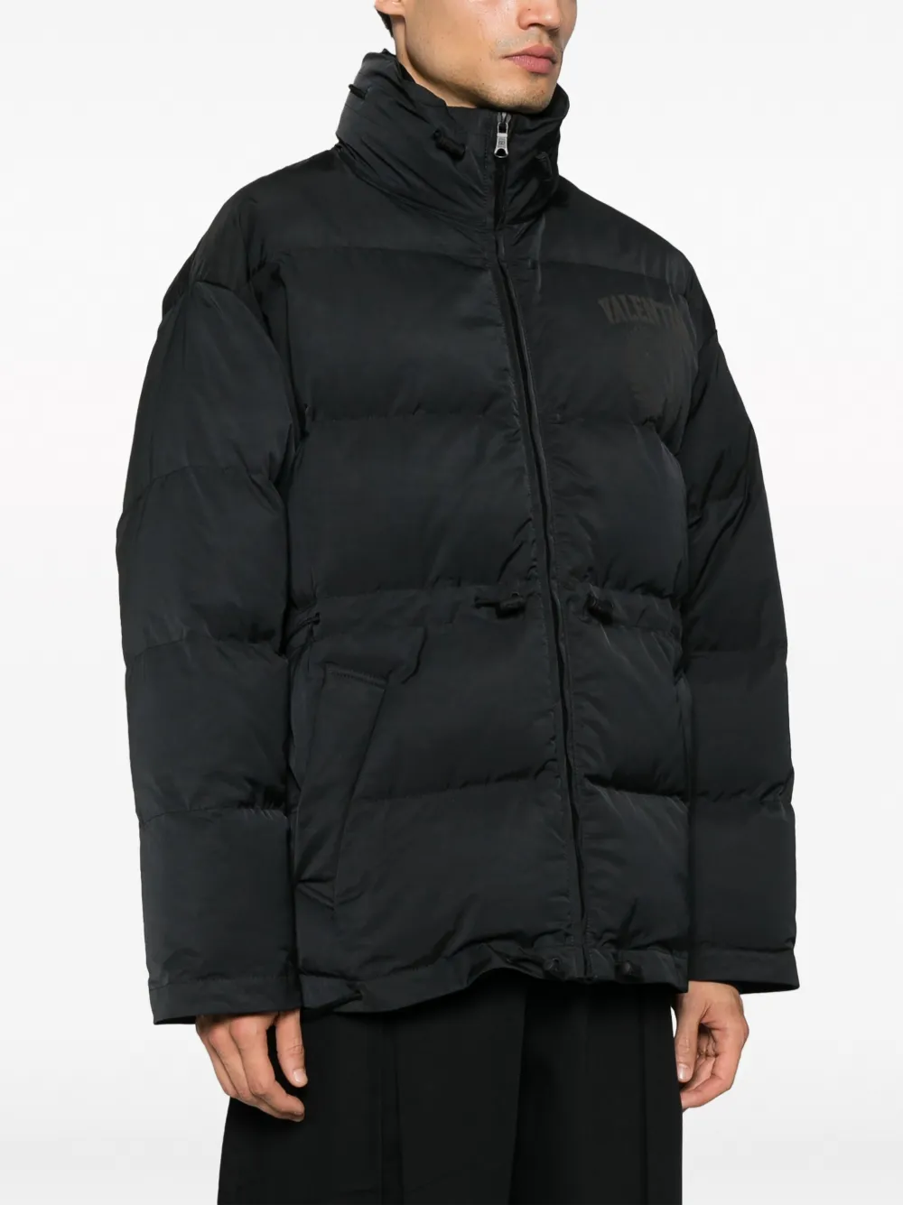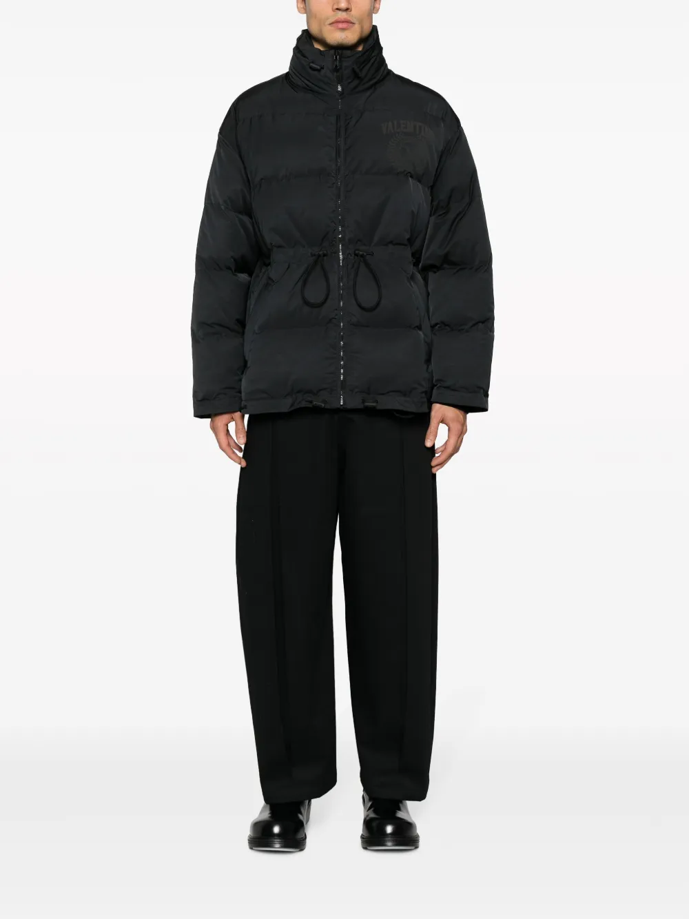 Коллекция Valentino Ready To Wear, черный, наполнитель из пуха и перьев, дутый материал, принт с логотипом на груди, декор VLogo Signature, воротник-труба, застежка на молнии спереди, кулиска на талии, длинные рукава и два прорезных кармана по бокам. Образ включает аксессуары Valentino Garavani.