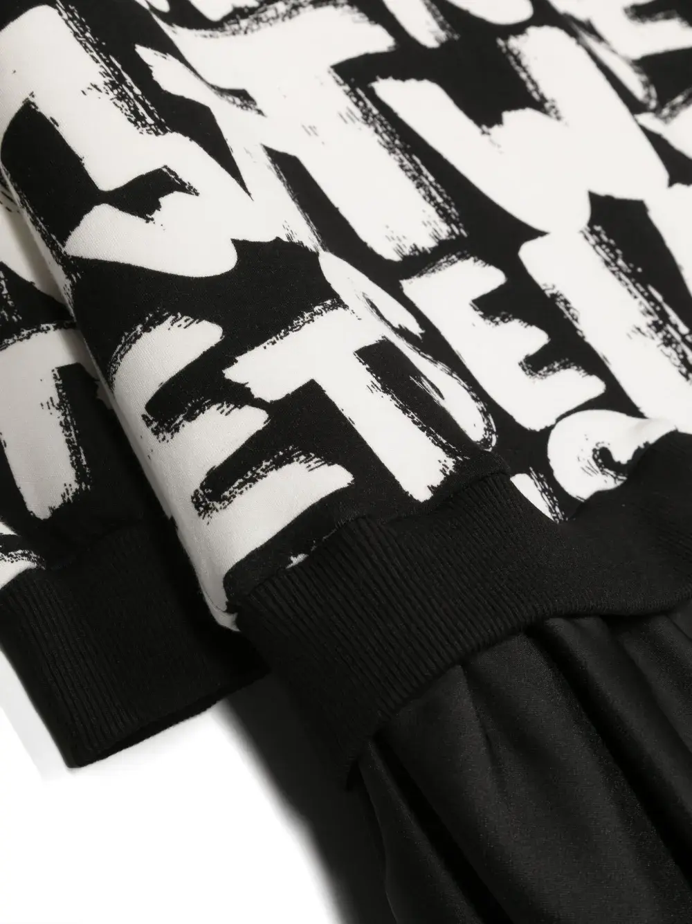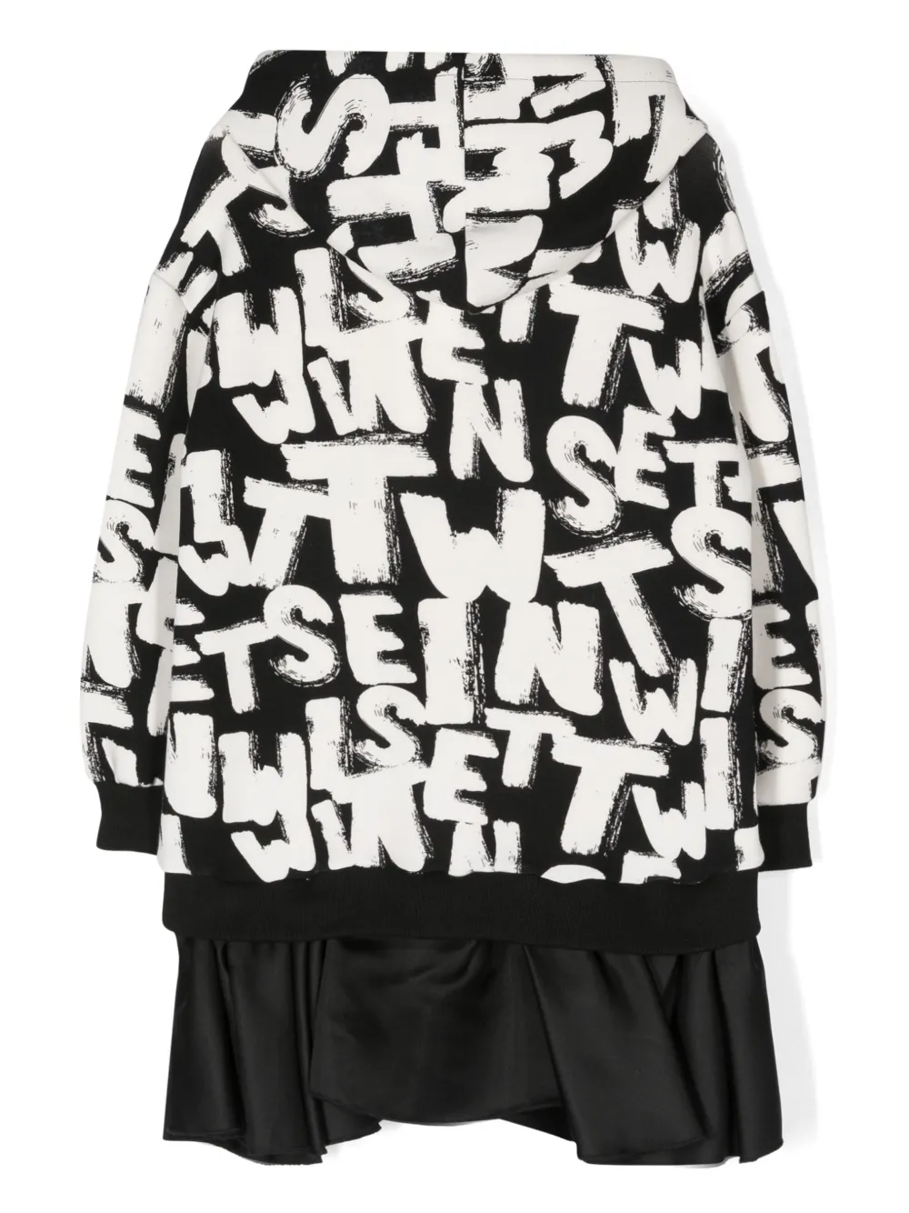 Черный/белый, эластичный материал, многослойный дизайн, расклешенный крой, сплошной принт с логотипом, логотип, вставки с оборками, объемный капюшон, модель без застежки и длинные рукава.