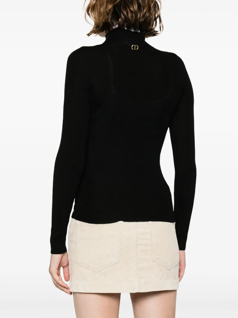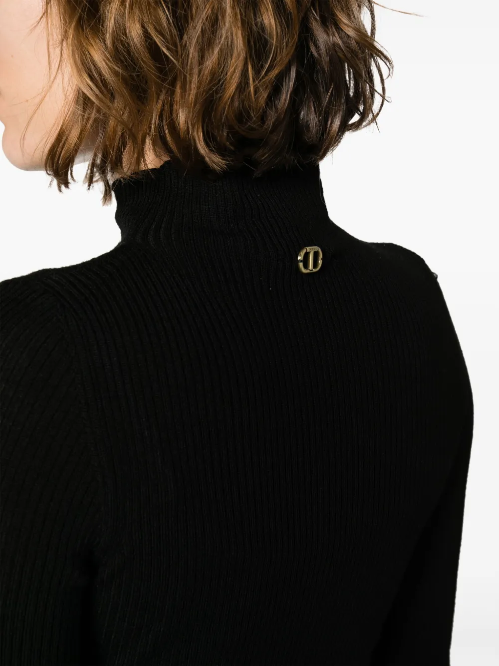 Черный, шерсть, трикотажный материал, трикотаж в рубчик, золотистый металлический логотип, высокий воротник, длинные рукава и прямой подол.
