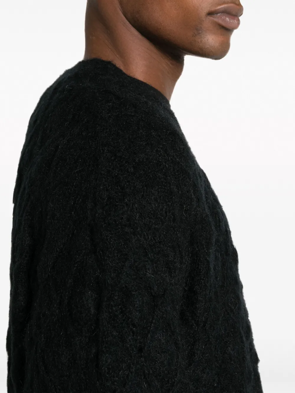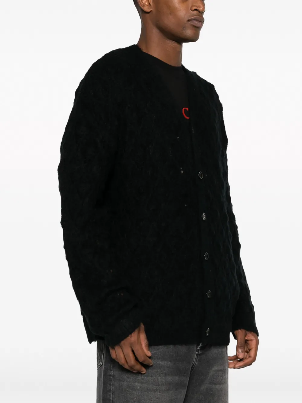 Черный, ажурная вязка, V-образный вырез, застежка на пуговицах спереди и длинные рукава.