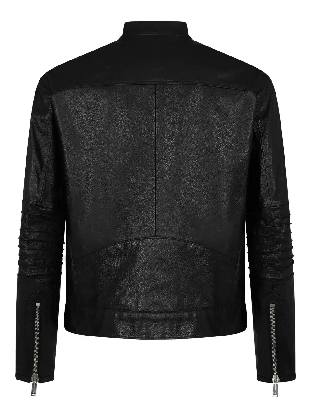Телячья кожа, зернистая текстура, строчка в тон, серебристая фурнитура, складки, воротник-стойка, двусторонняя молния спереди, длинные рукава, манжеты на молнии, два нагрудных кармана на молнии и прямой подол.