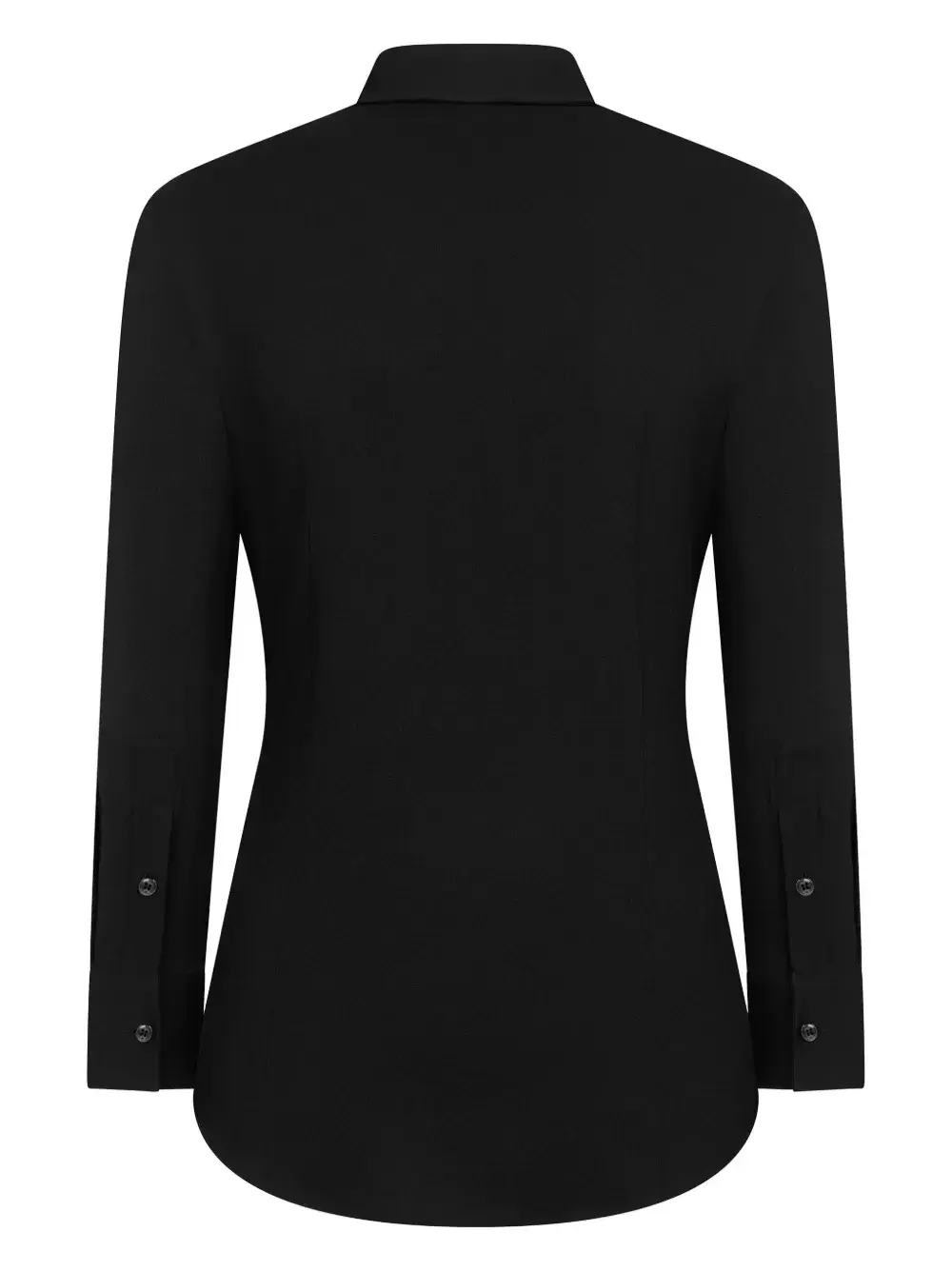 Черный, аппликация, декор из кристаллов, отложной воротник, застежка на пуговицах спереди, длинные рукава, манжеты на пуговицах и закругленный подол.