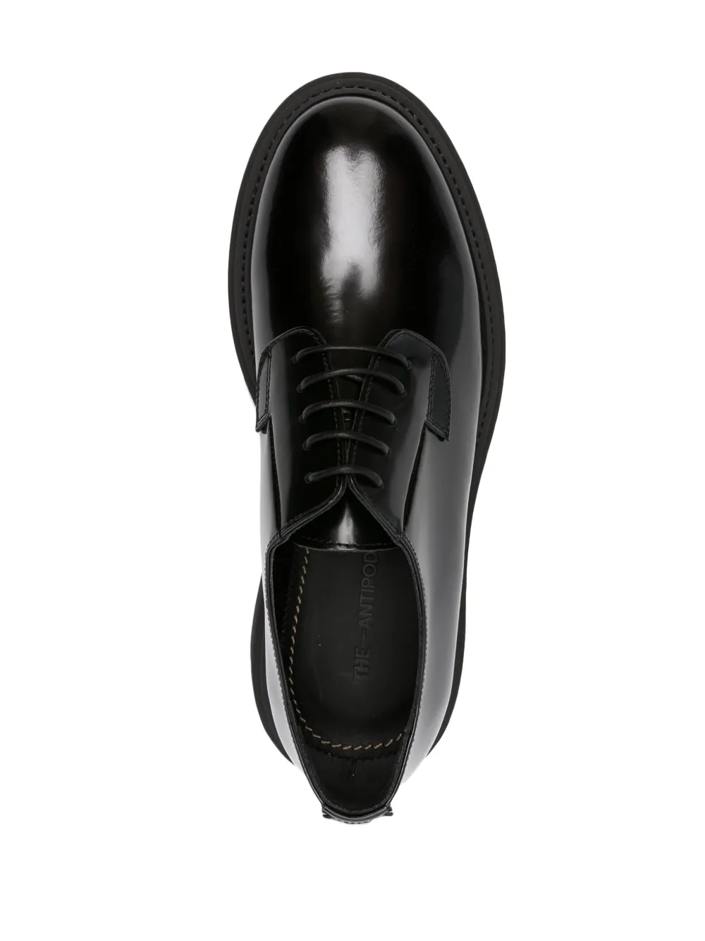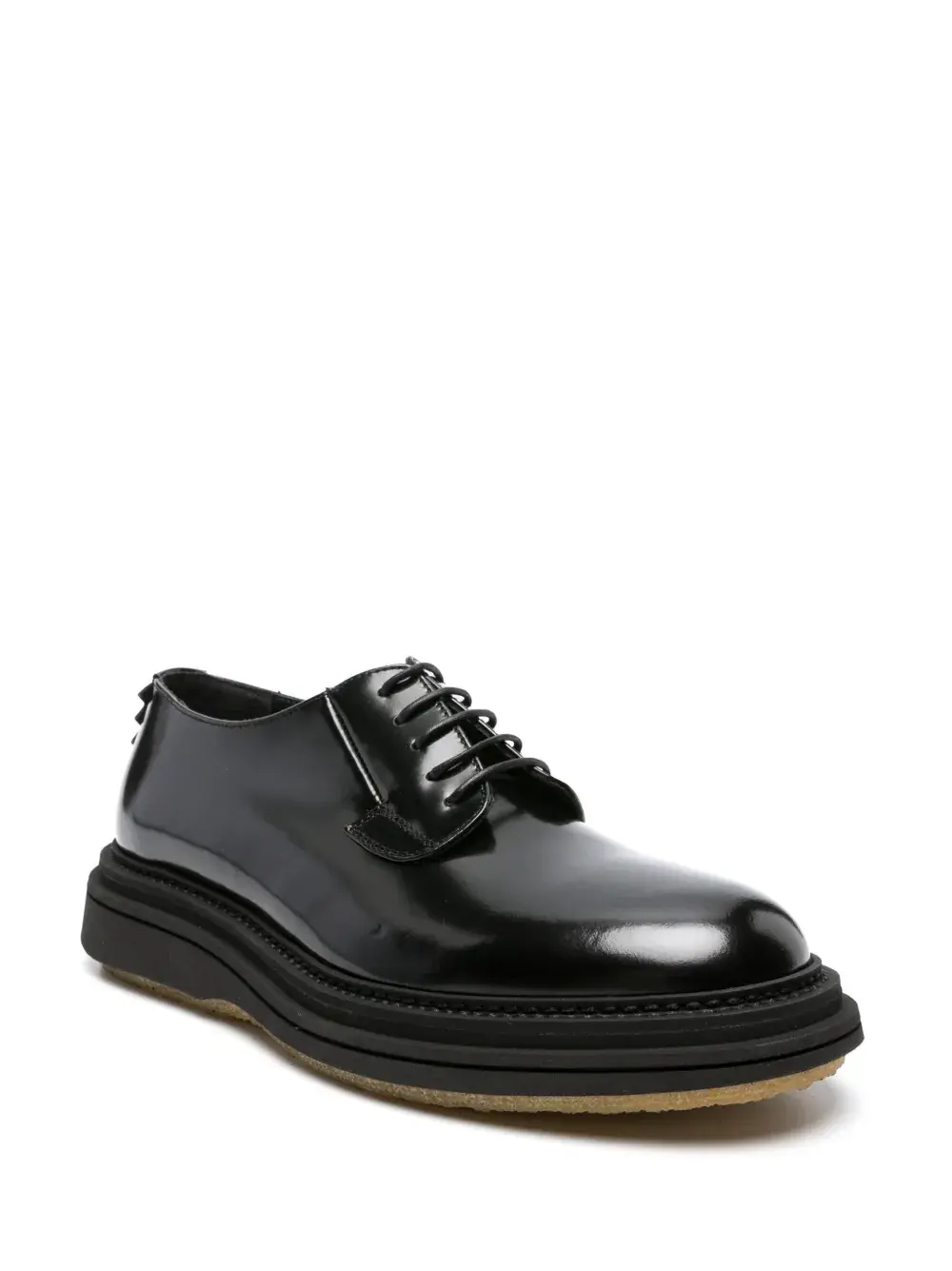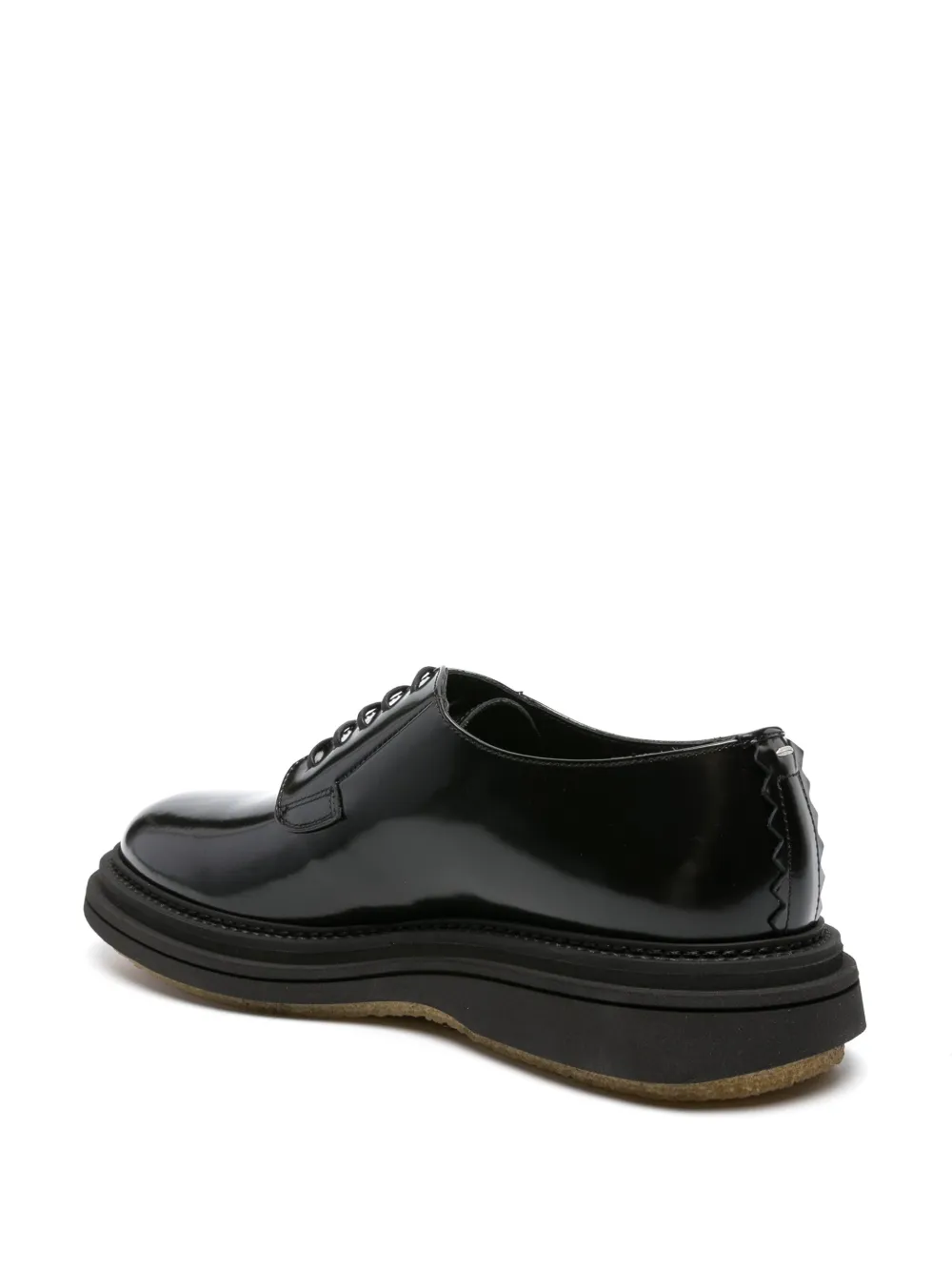 Черный, телячья кожа, глянцевая фактура, закругленный носок, шнуровка спереди и резиновая подошва.