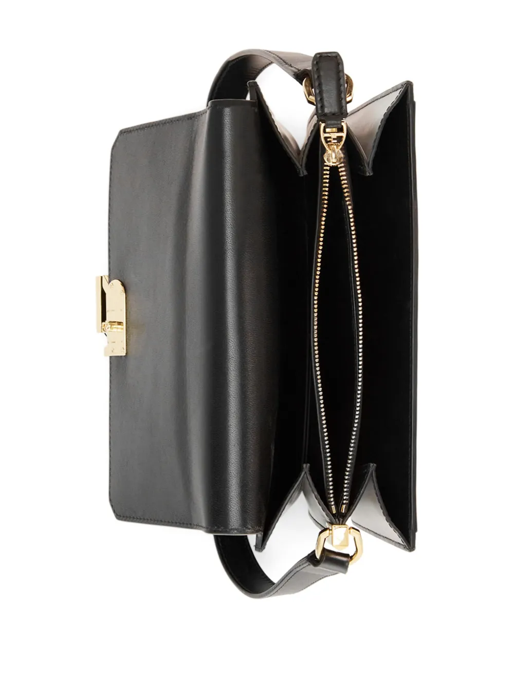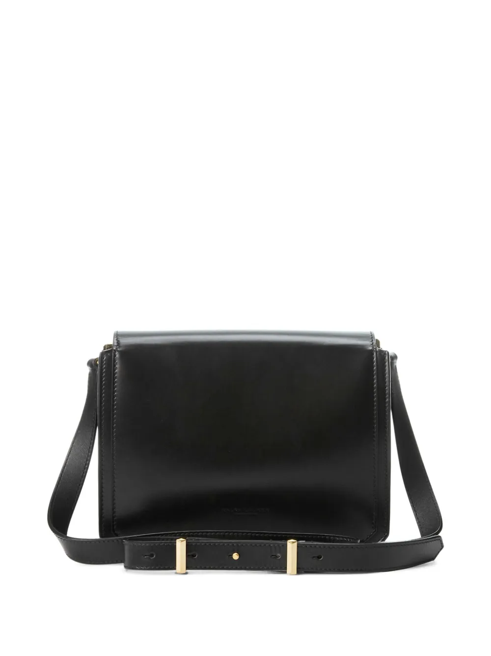 Черный, телячья кожа, золотистый металлический логотип, золотистая фурнитура, регулируемый ремень на плечо, откидной клапан на магните, несколько отделений и внутренний карман на молнии.
