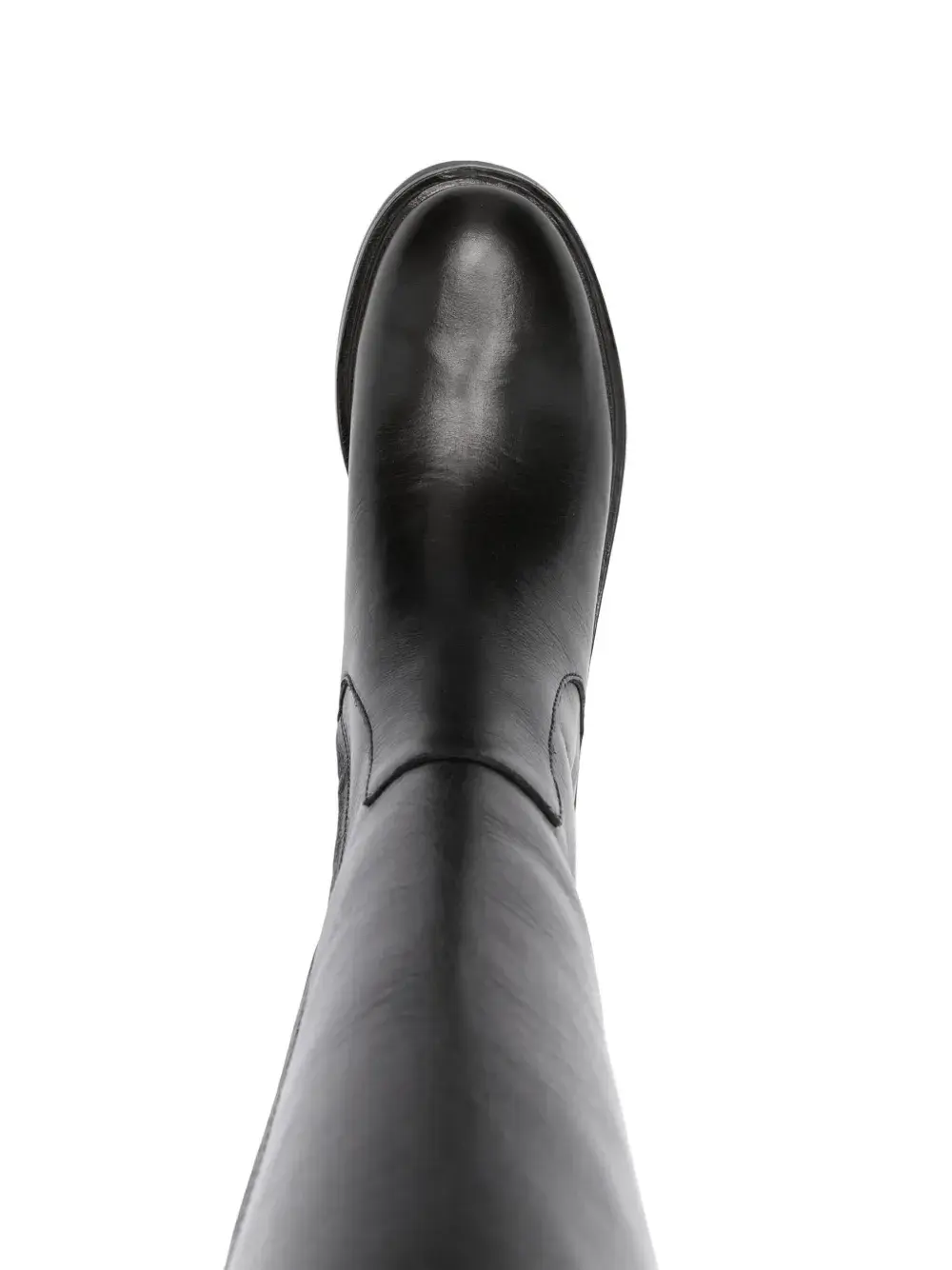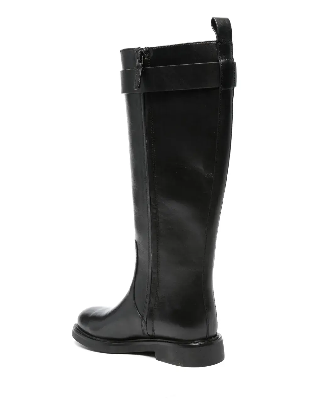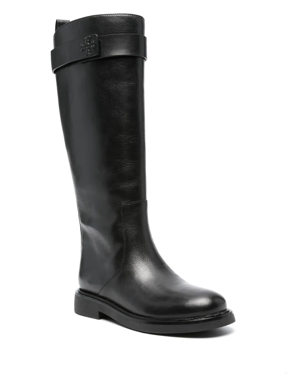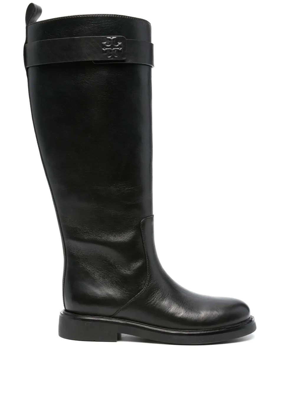 Черный, телячья кожа, декор Double T, закругленный носок, застежка на липучке сбоку, застежка на молнии сбоку, петля для подтягивания сзади, высота по колено и плоская резиновая подошва.