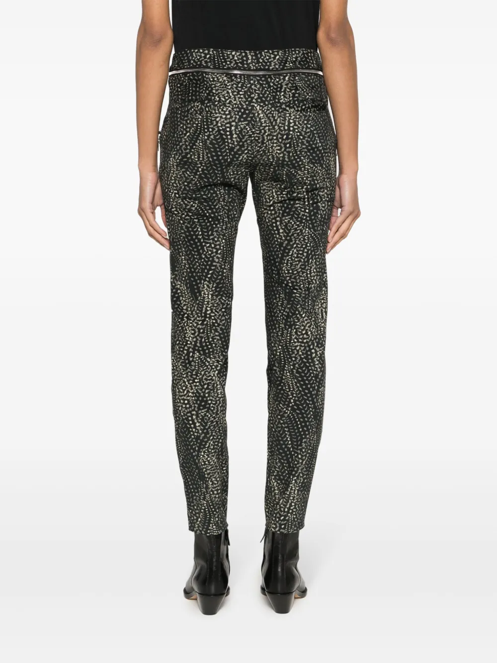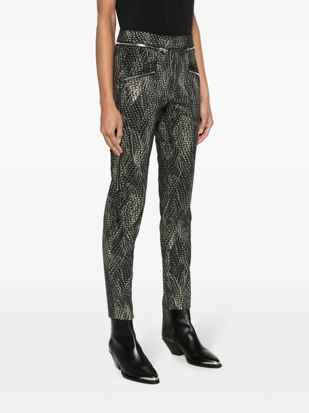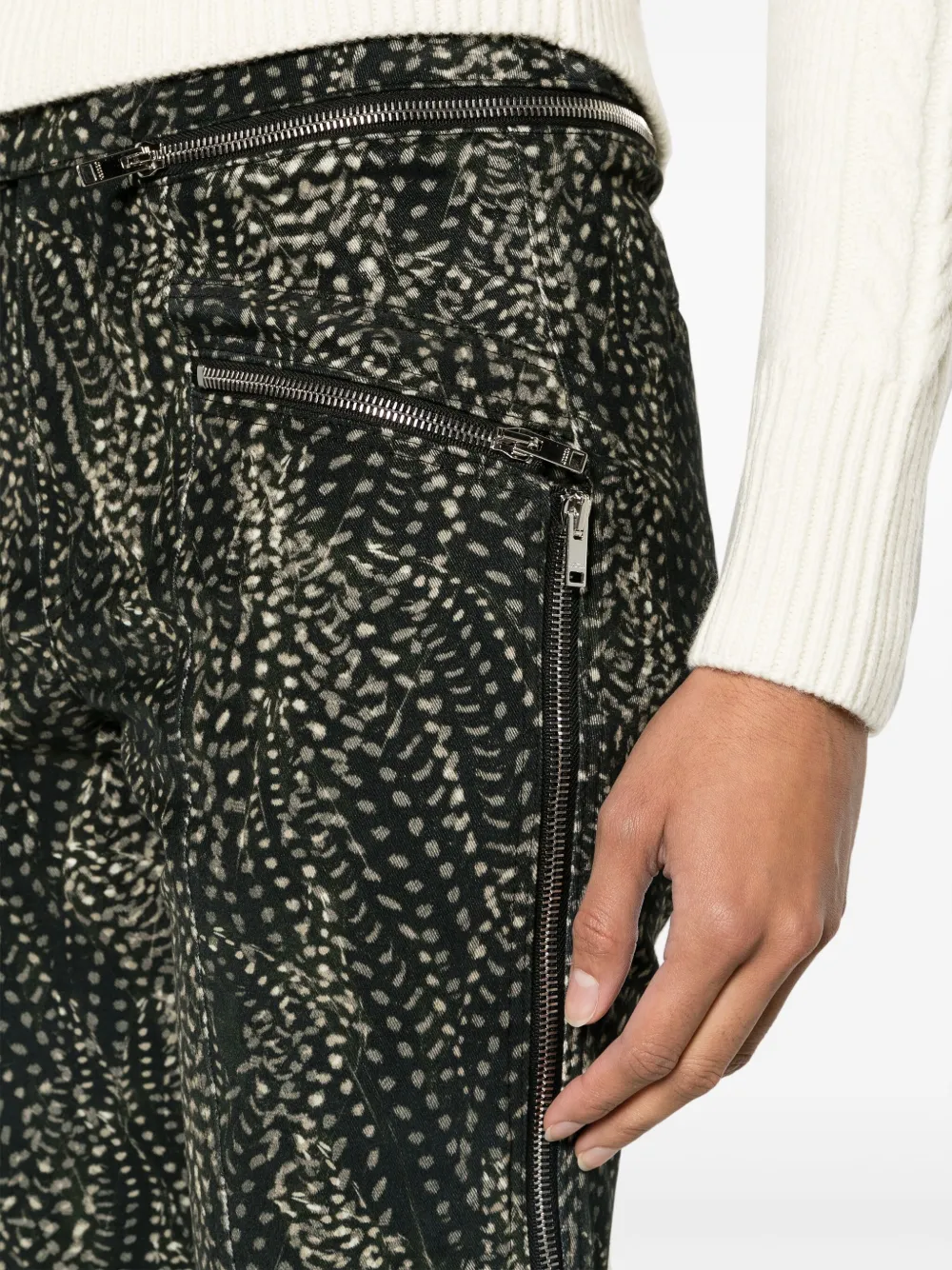 Черный/серый, кремовый, эластичный хлопок, абстрактный принт, детали с молниями, узкий крой, низкая посадка, застежка на кнопки и молнию спереди, передние карманы на молнии и два кармана с листочкой сзади.