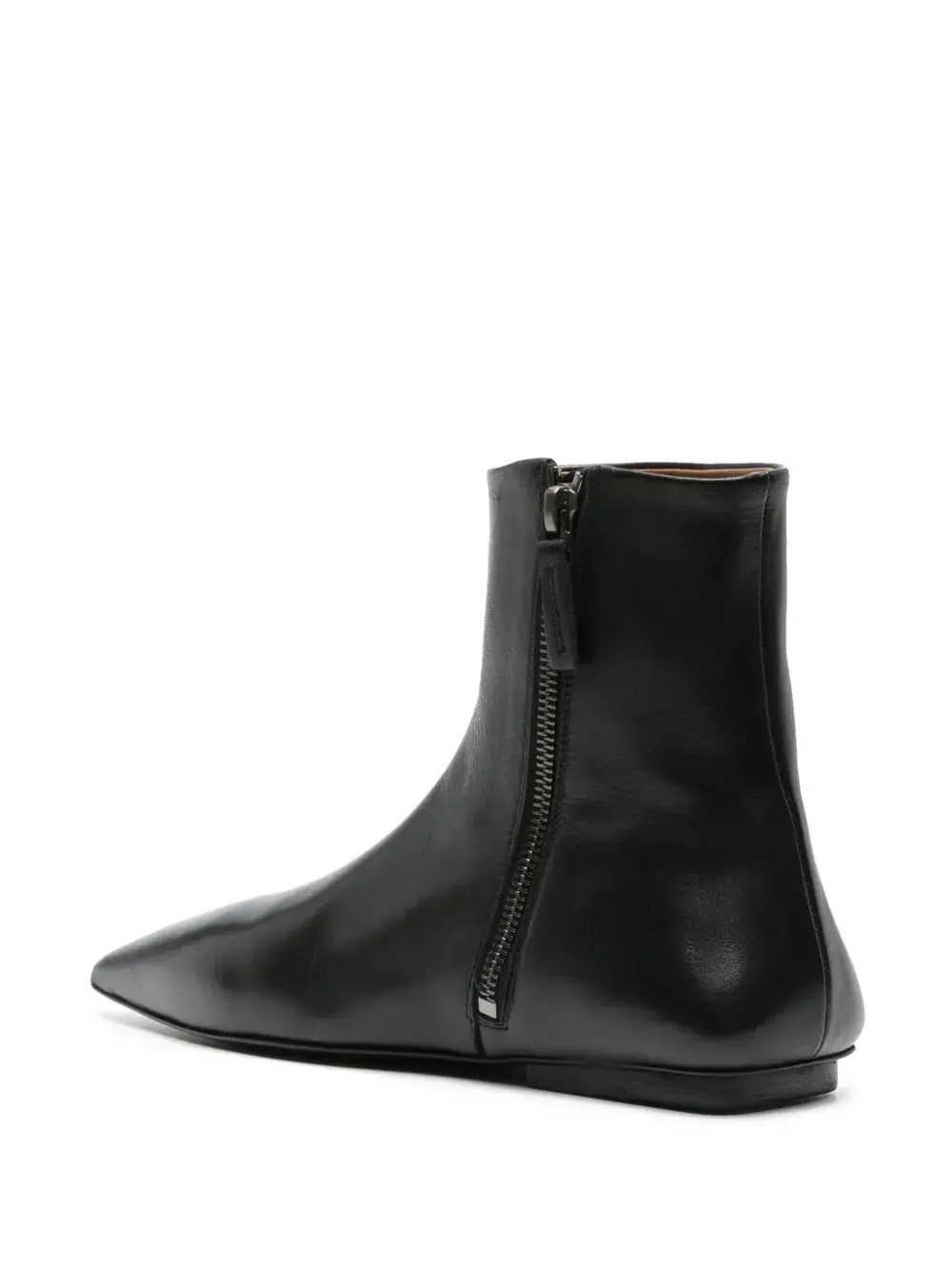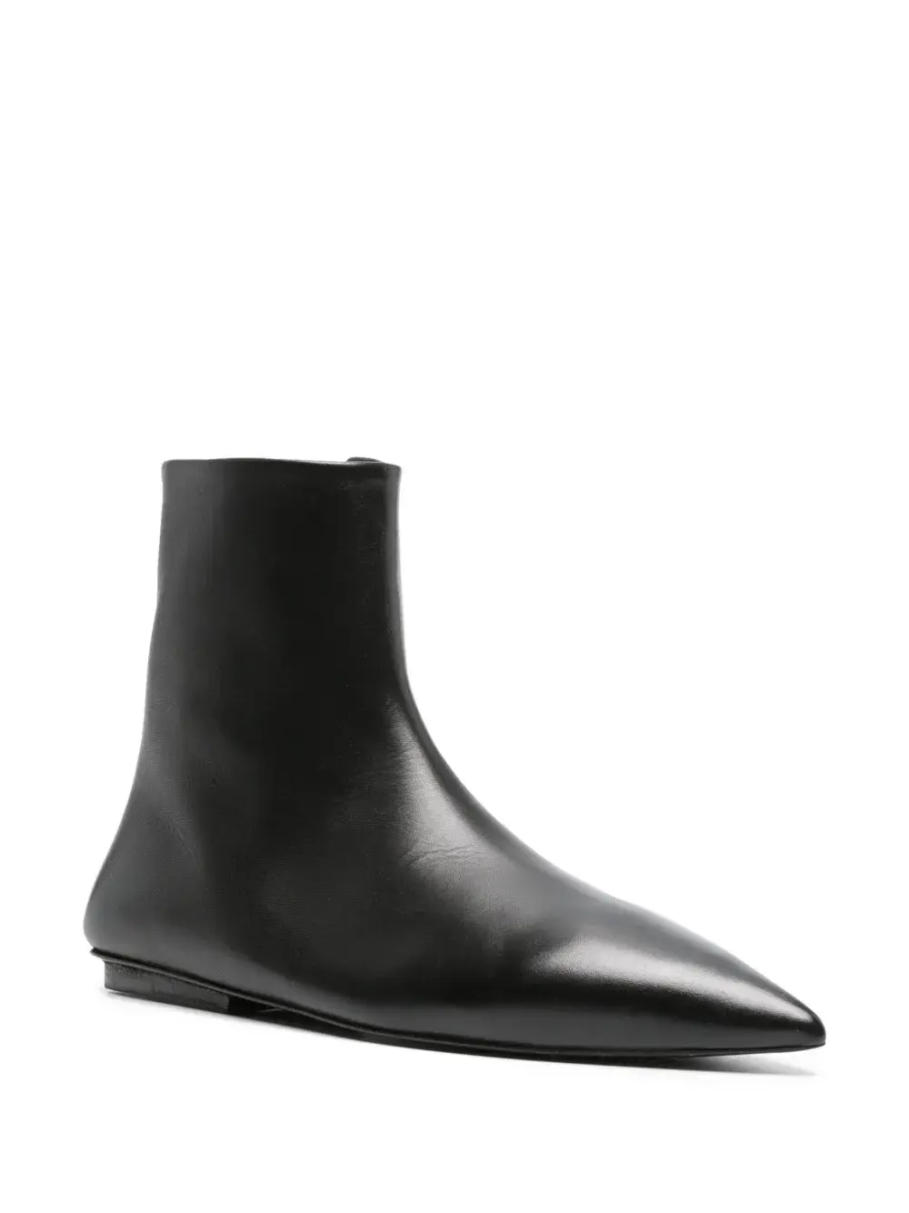 Черный, телячья кожа, гладкая текстура кожи, заостренный носок, застежки на молнии сбоку и плоская кожаная подошва.