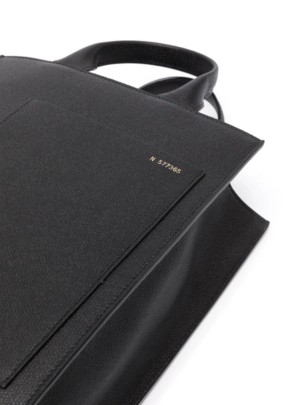 Черный, телячья кожа, зернистая текстура, дизайн с открытым верхом, две верхние ручки, съемный ремень на плечо, накладной карман спереди, тисненый логотип внутри, внутренние прорезные карманы, основное отделение и серебристая фурнитура. В комплект входит мешок-пыльник для хранения.