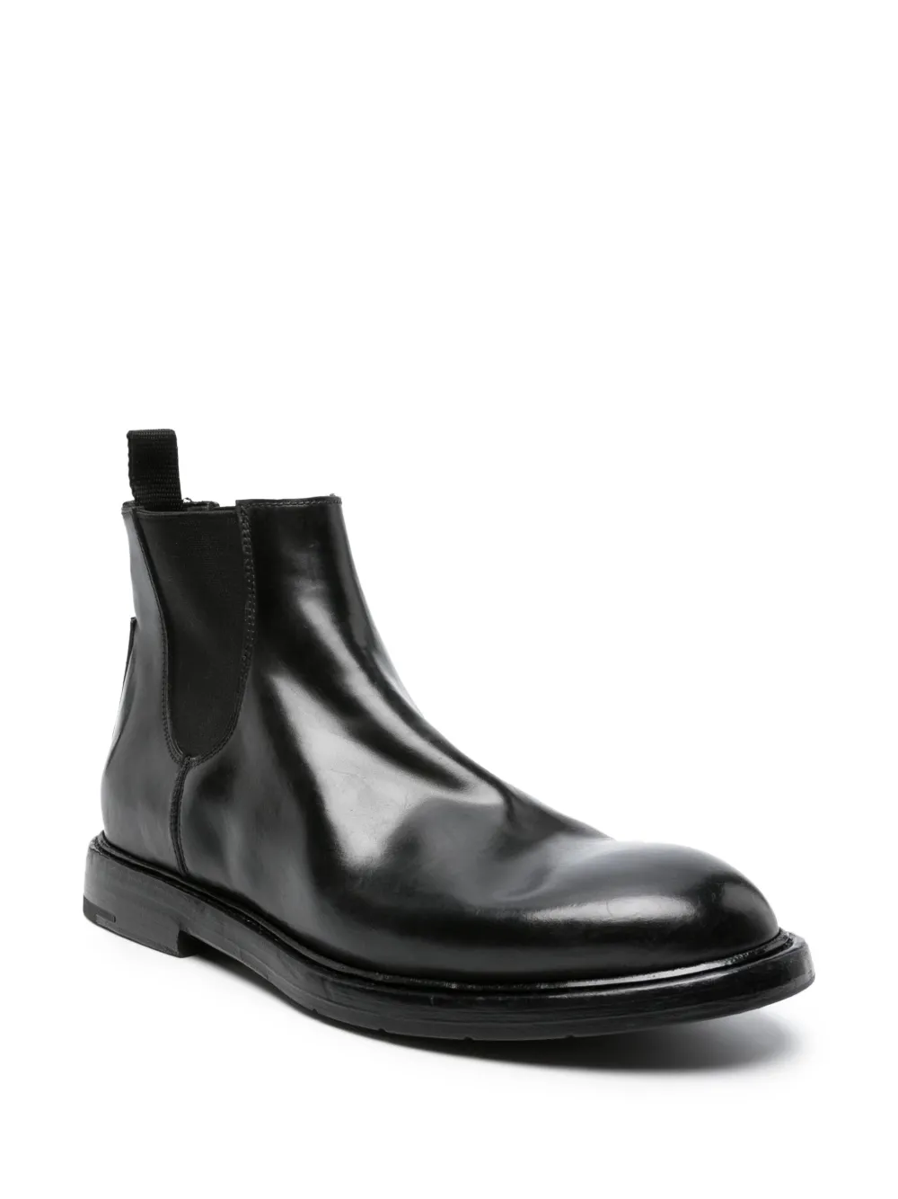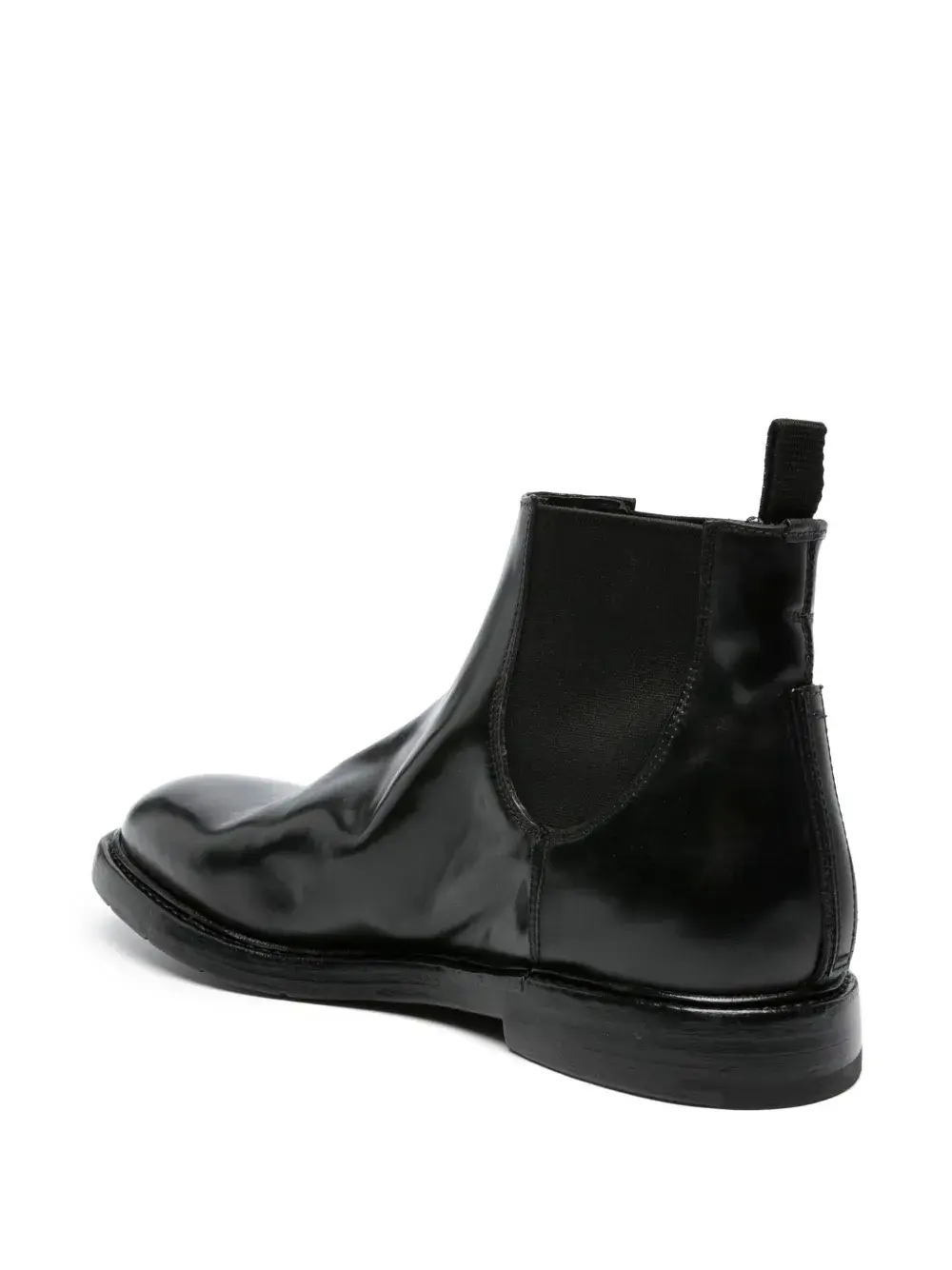 Черный, телячья кожа, эластичные боковые вставки, закругленный носок, модель без застежки, высота по щиколотку, петля для подтягивания сзади, кожаная стелька с логотипом, низкий каблук и резиновая подошва.