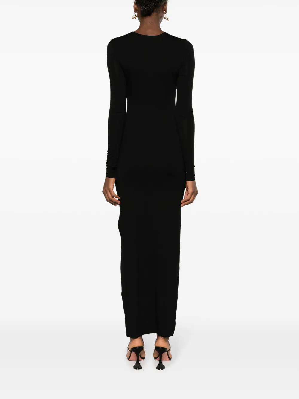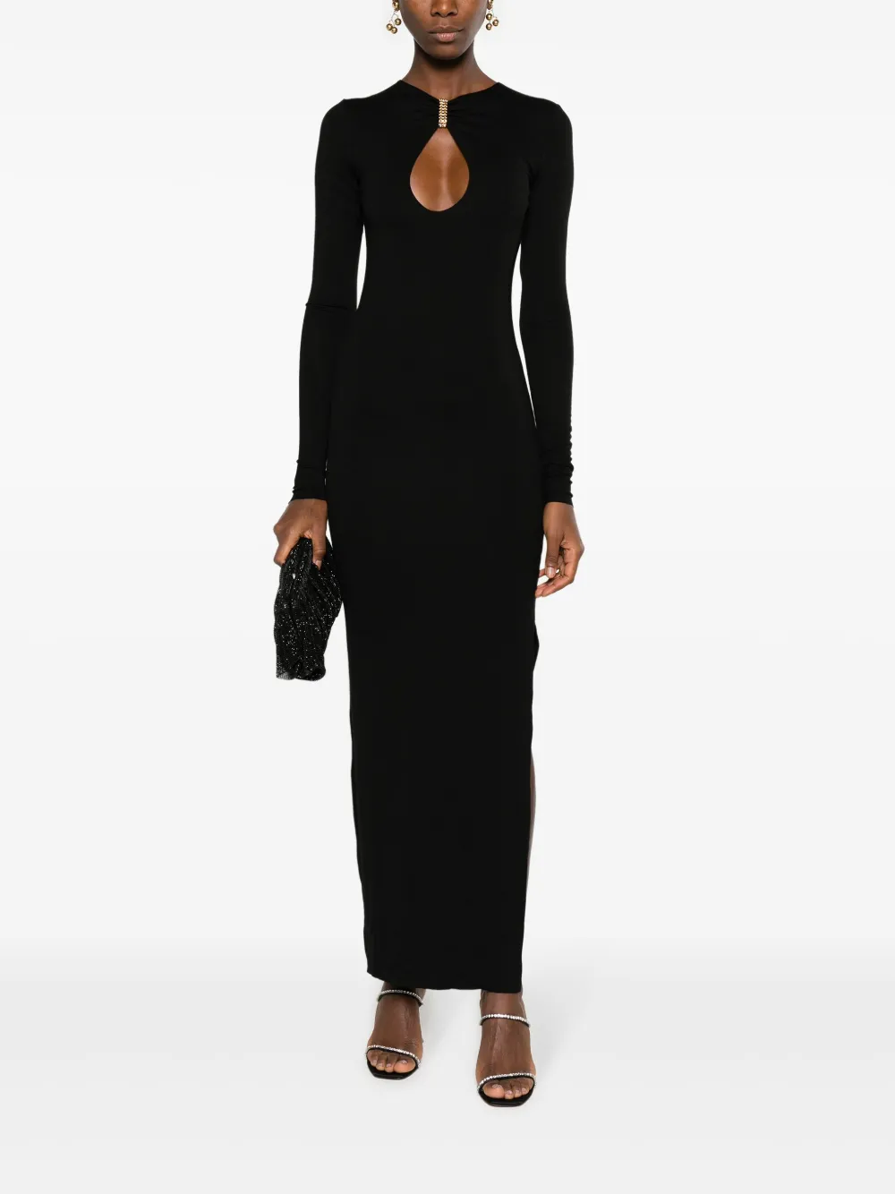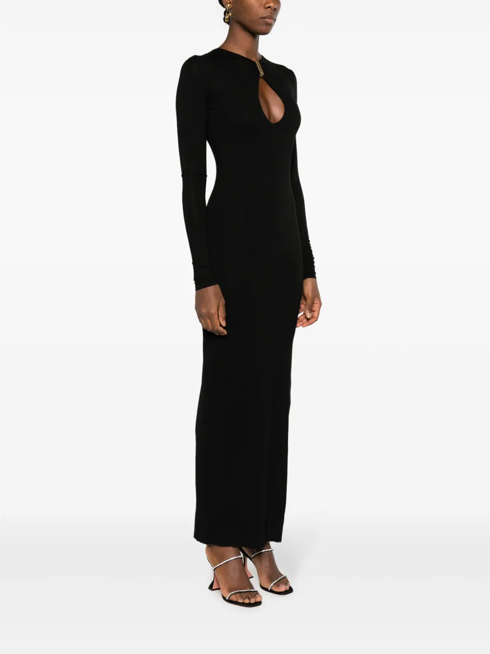 Черный, эластичный материал, цепочка, вырез с прорезью, длинные рукава, длина миди и прямой подол.