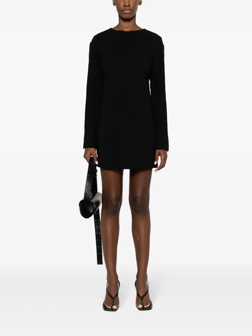 Черный, аппликация, круглый вырез, застежка на молнии сзади, длинные рукава, длина до бедер и прямой подол.