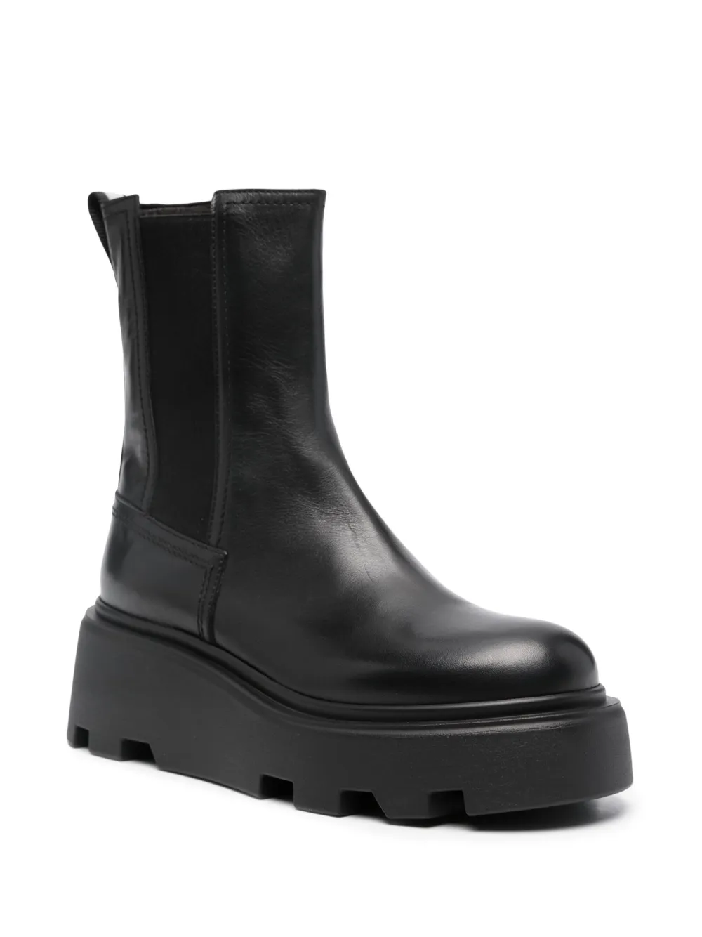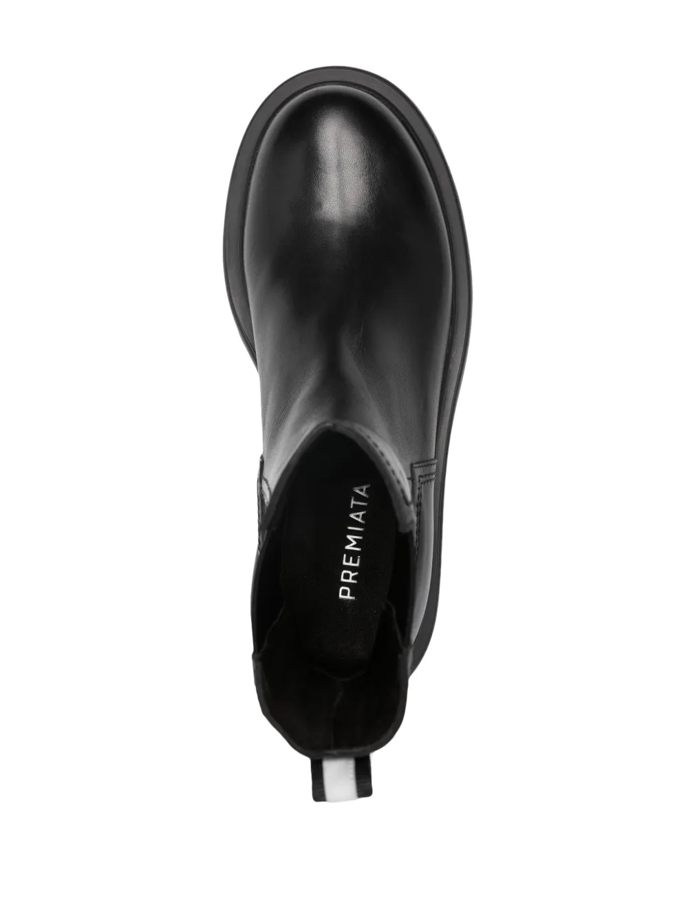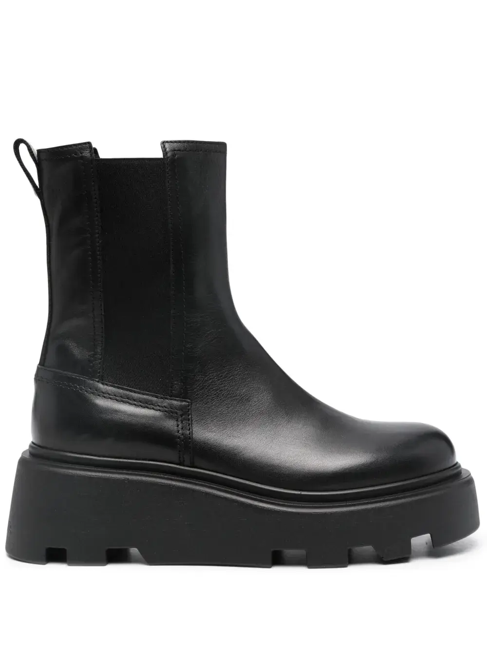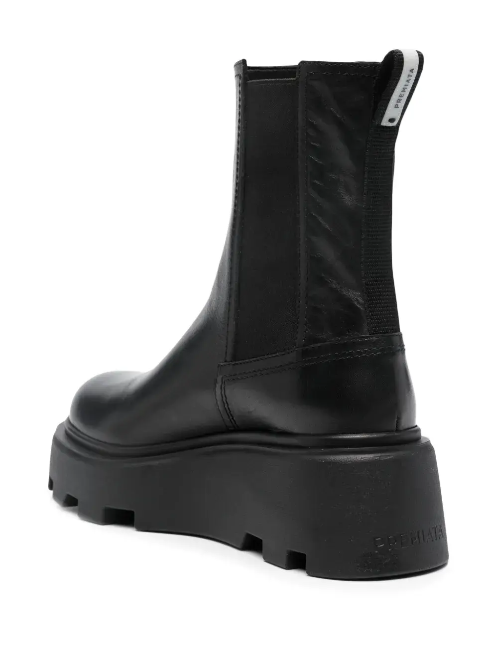 Черный, телячья кожа, петля для подтягивания с логотипом, модель без застежки, эластичные манжеты, кожаная стелька с логотипом, массивная резиновая подошва, блочный каблук средней высоты и закругленный носок.