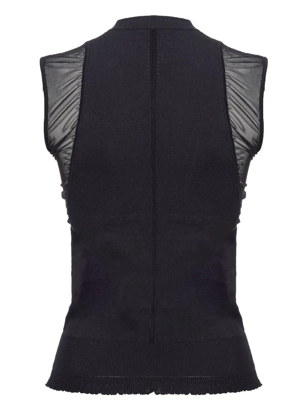 Эластичный материал, полупрозрачный дизайн, вышитый логотип спереди, высокий воротник, без рукавов и прямой подол.