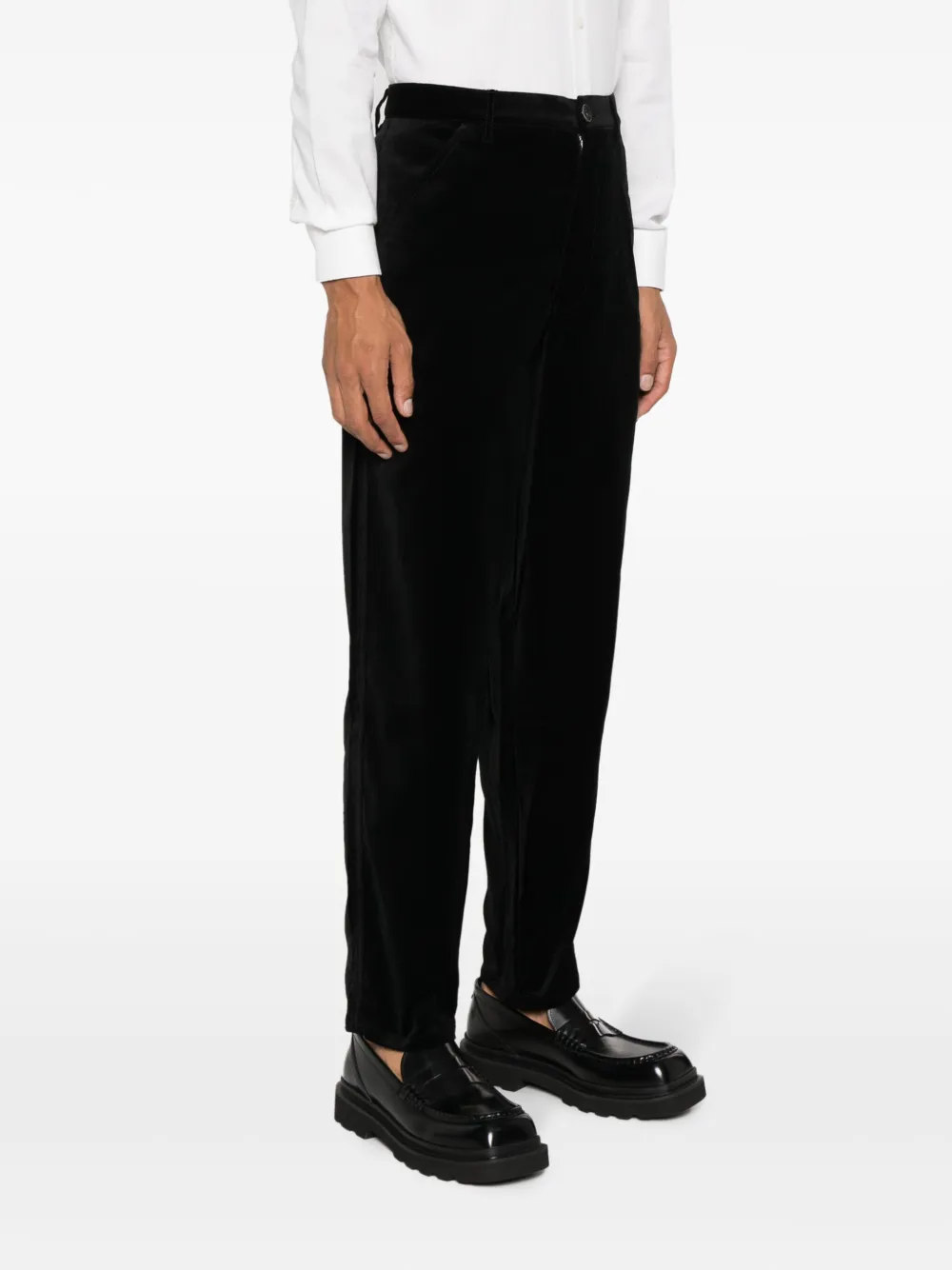 Черный, хлопок, бархатистое покрытие, петли для ремня, застежка на молнии и пуговице спереди, завышенная талия, прямой крой, два вшитых кармана по бокам и два накладных кармана сзади.