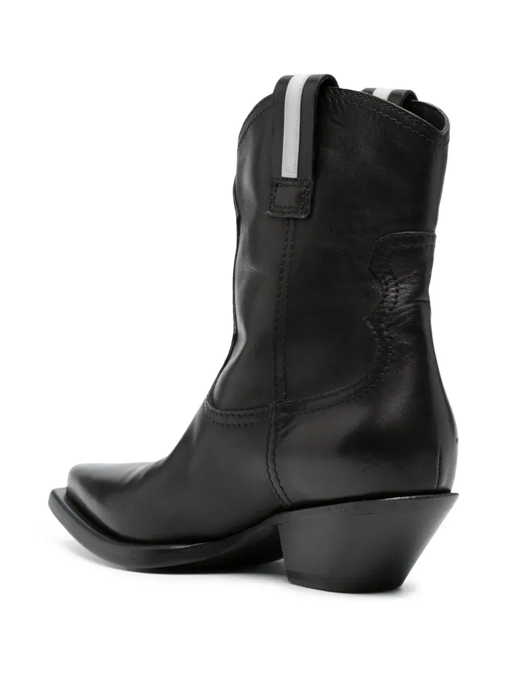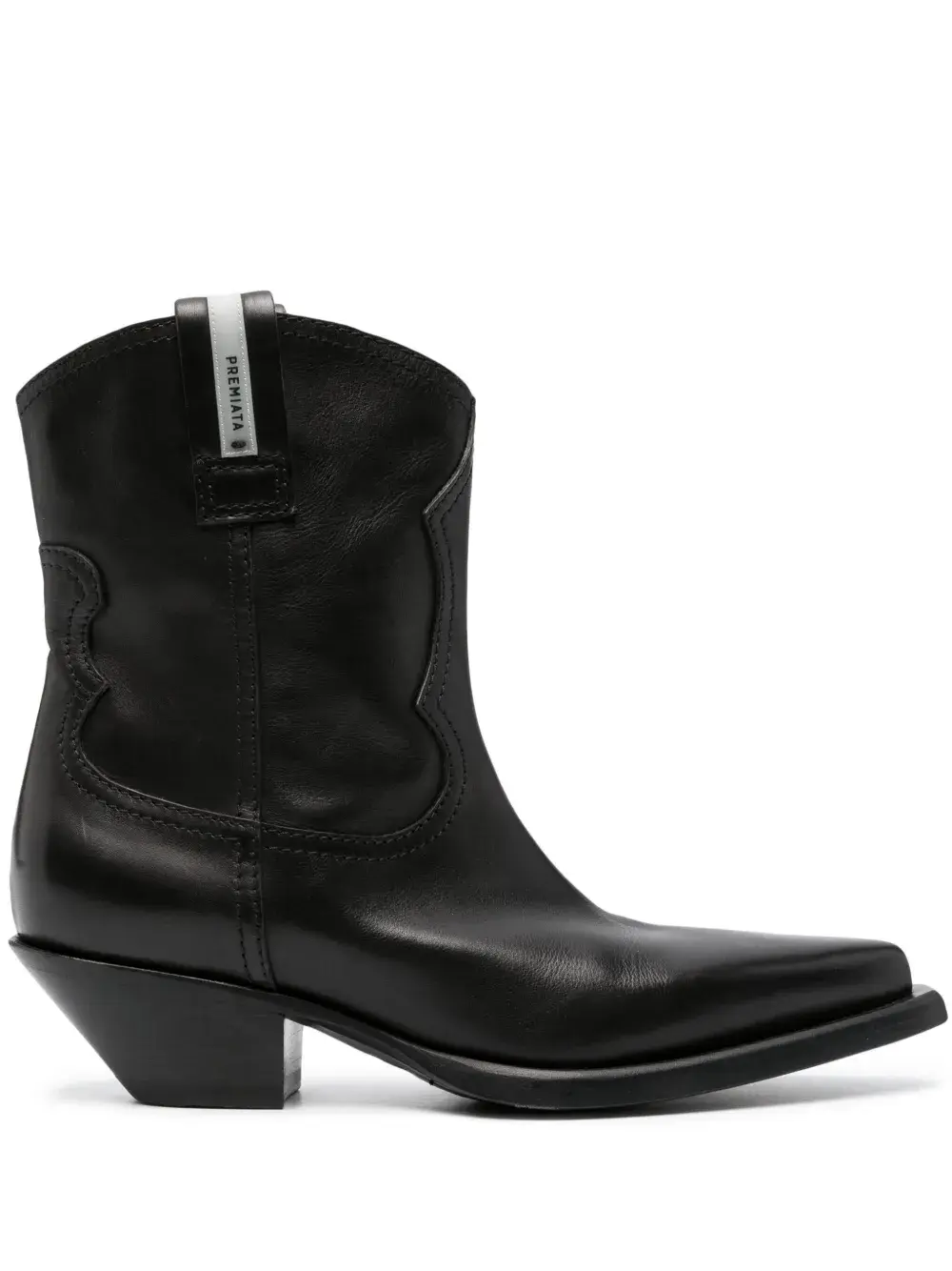 Черный, телячья кожа, заостренный носок, модель в стиле вестерн, декоративная строчка, модель без застежки и блочный каблук средней высоты.