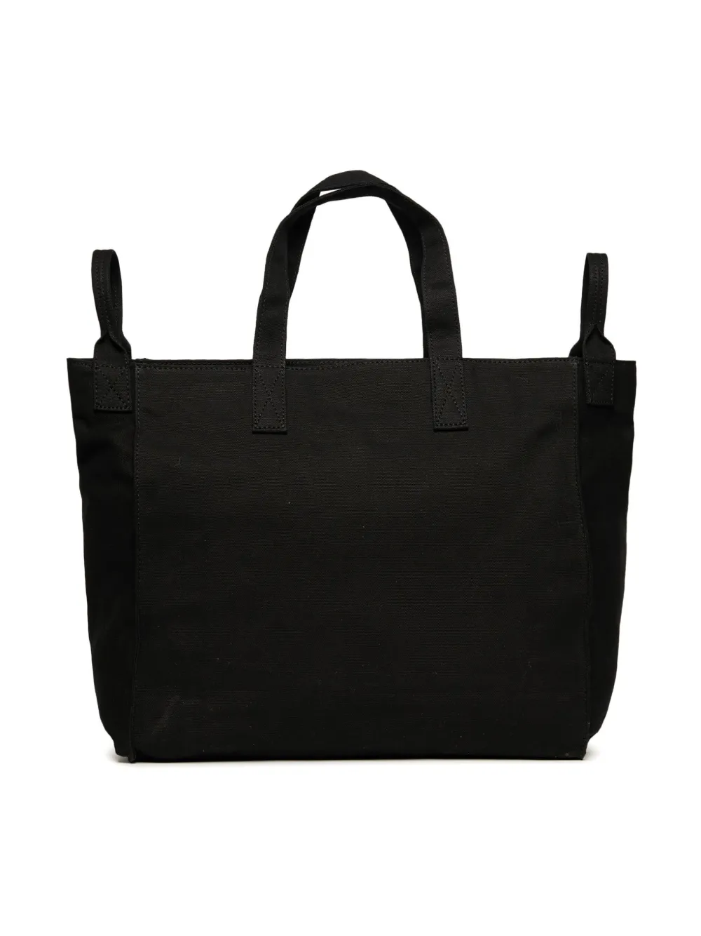 Черный, хлопок, парусина, логотип спереди, строчка в тон, потайная застежка на молнии, два плоских ремня на плечо, две верхние ручки и основное отделение.