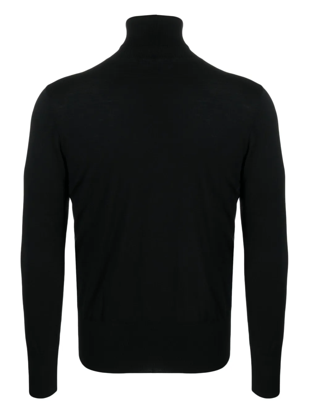 Черный, шерсть, трикотажный материал, высокий воротник, длинные рукава, приспущенные плечи и эластичный подол.