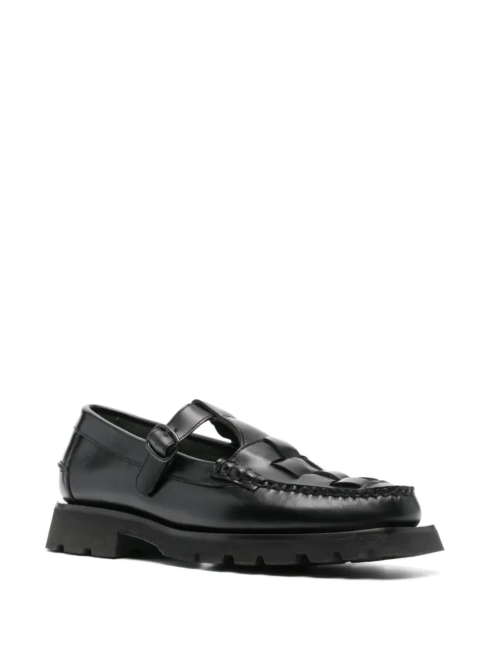 Телячья кожа, переплетенный дизайн, строчка в тон, квадратный носок, застежка на пряжке, стелька с логотипом и резиновая подошва.