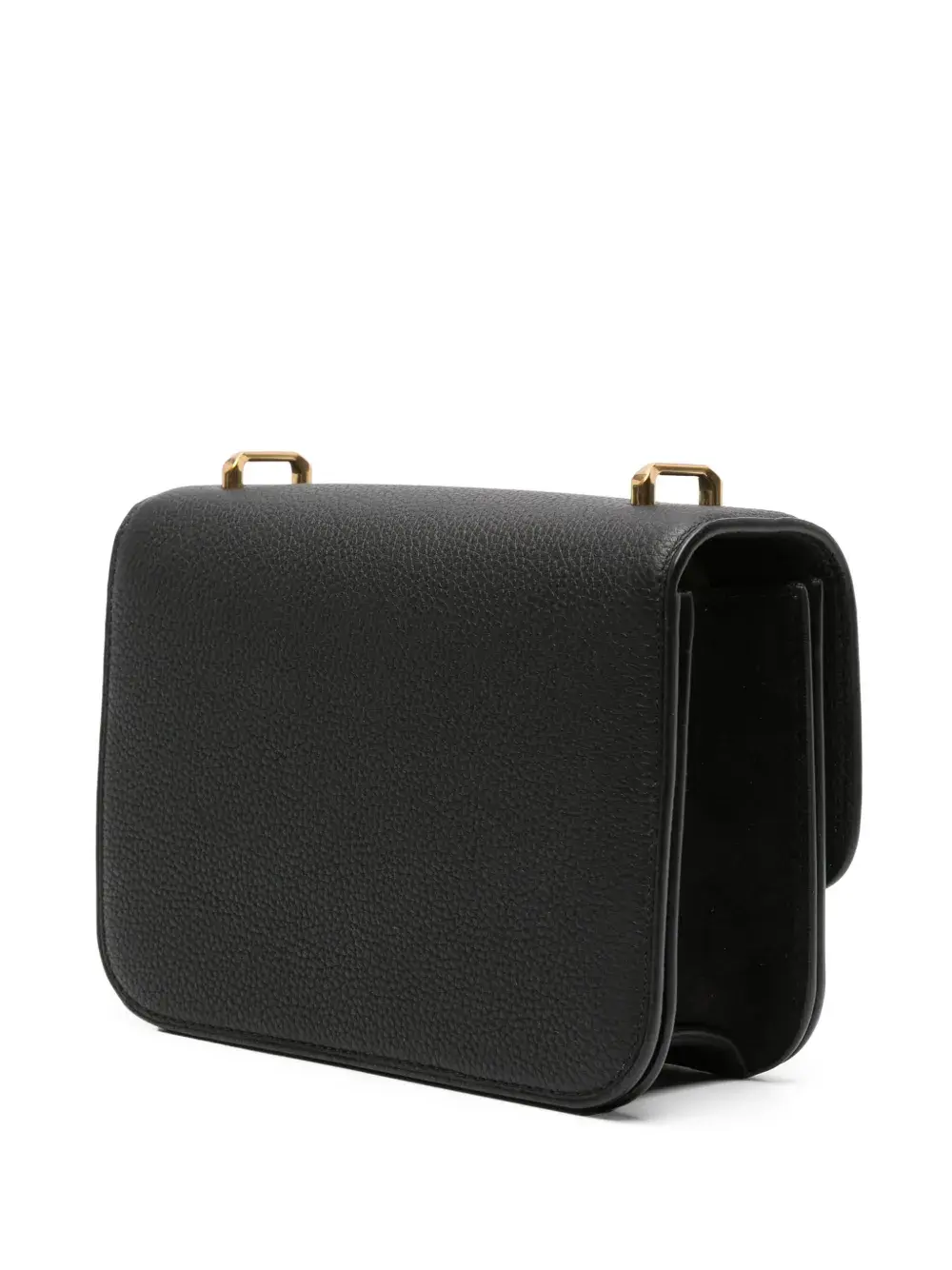 Черный, телячья кожа, золотистый металлический логотип, тисненый логотип внутри, золотистая фурнитура, откидной клапан на магните, съемный регулируемый ремень на плечо и основное отделение.