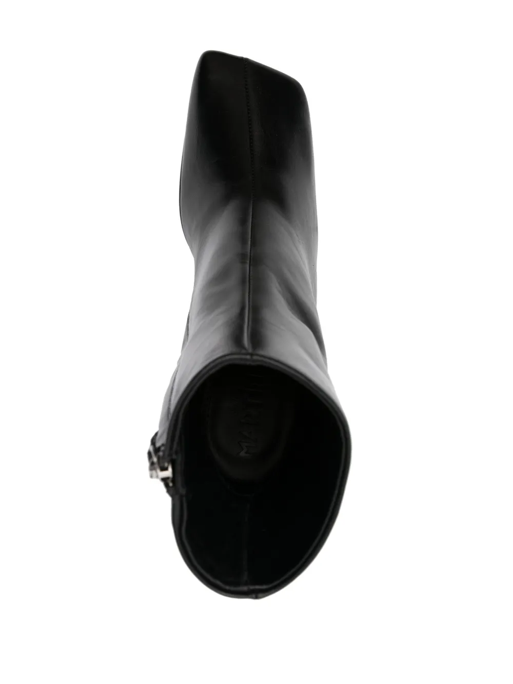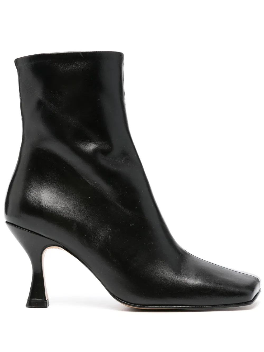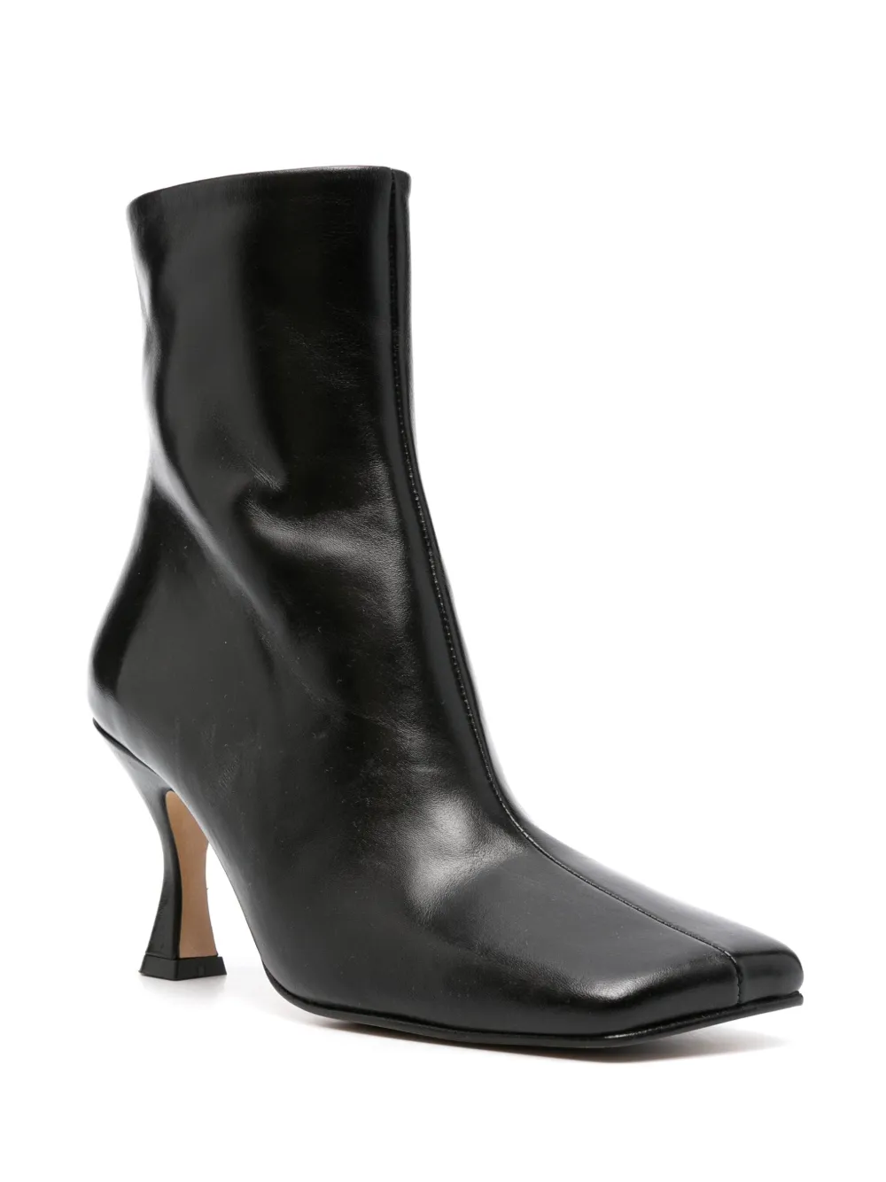 Черный, телячья кожа, квадратный носок, застежка на молнии сбоку, высота по щиколотку и высокий скульптурный каблук.