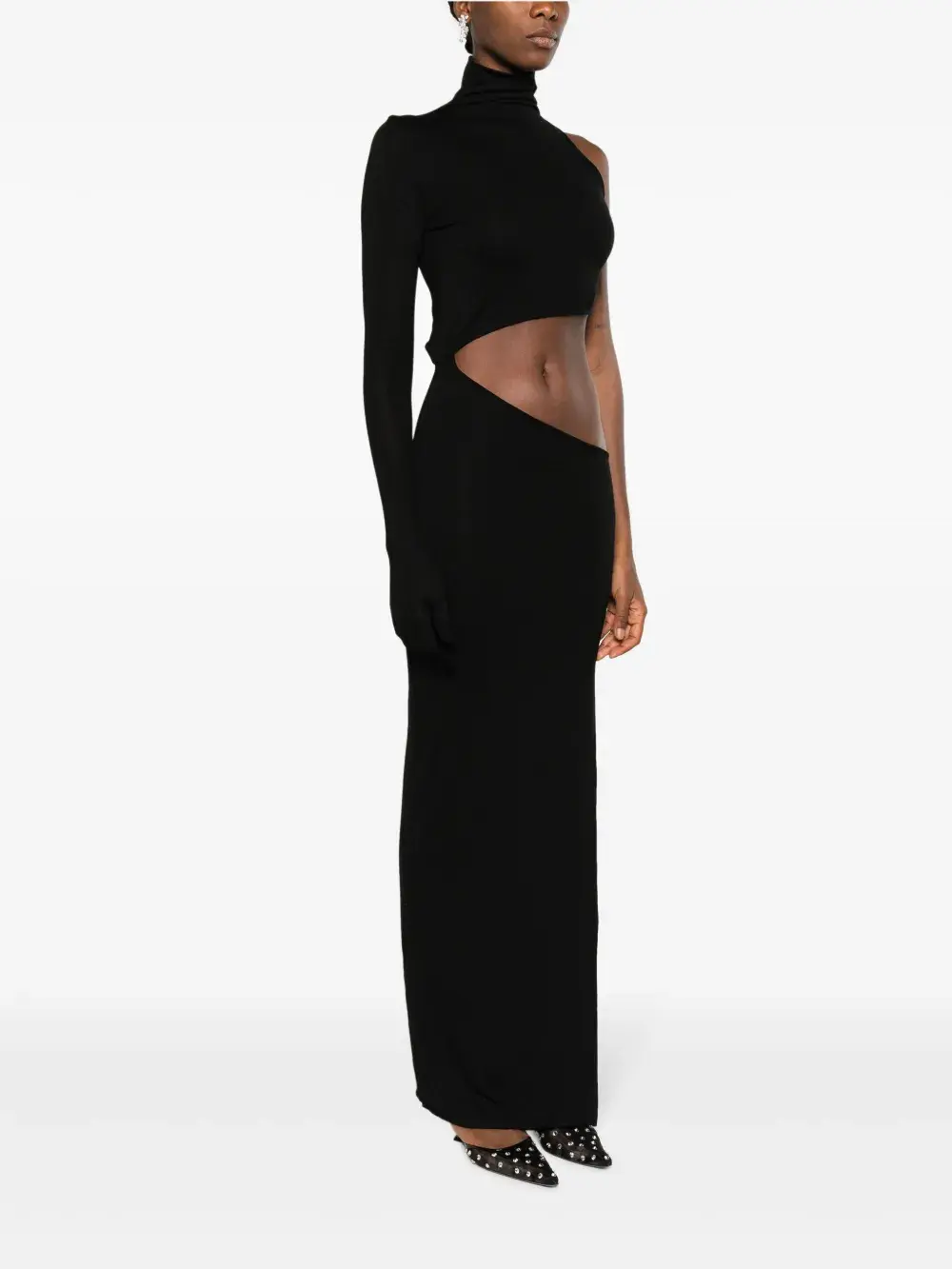 Черный, эластичный материал, вырезные детали, высокий воротник, модель на одном плече, длинные рукава, боковой разрез, длина миди и подол с кулиской.