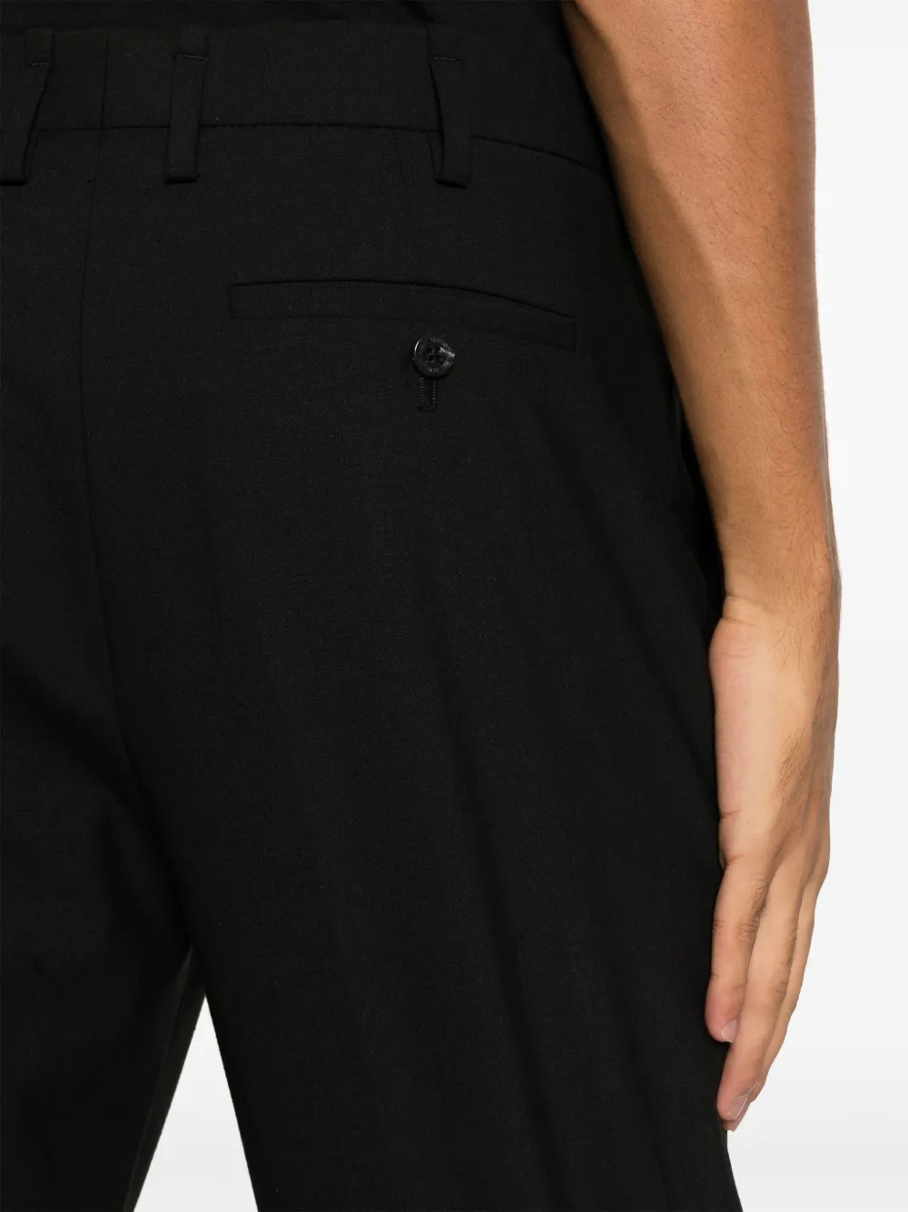 Черный, саржевое переплетение, стрелки, петли для ремня, средняя посадка, укороченная длина, зауженный крой, потайная застежка спереди, два вшитых кармана по бокам и два кармана с листочкой сзади.