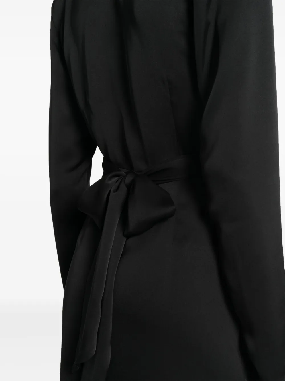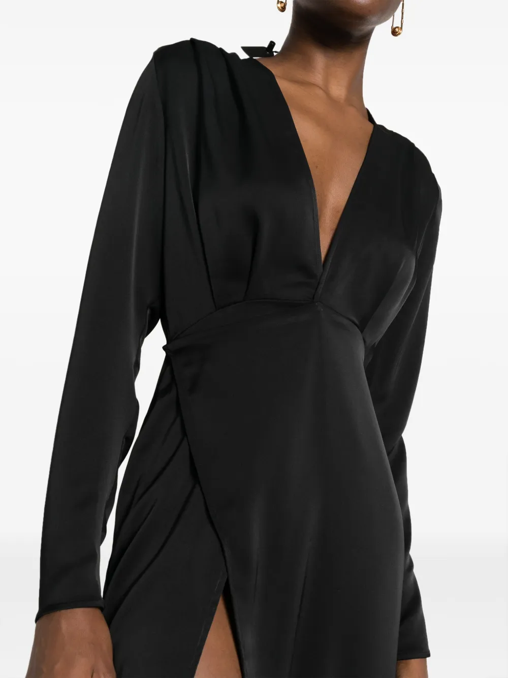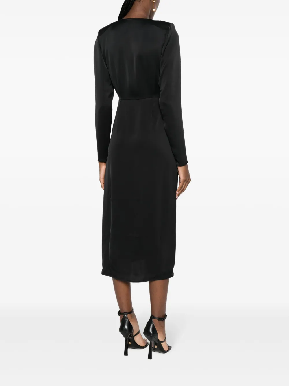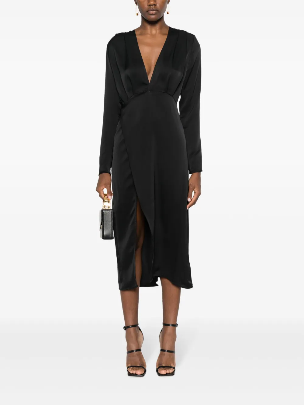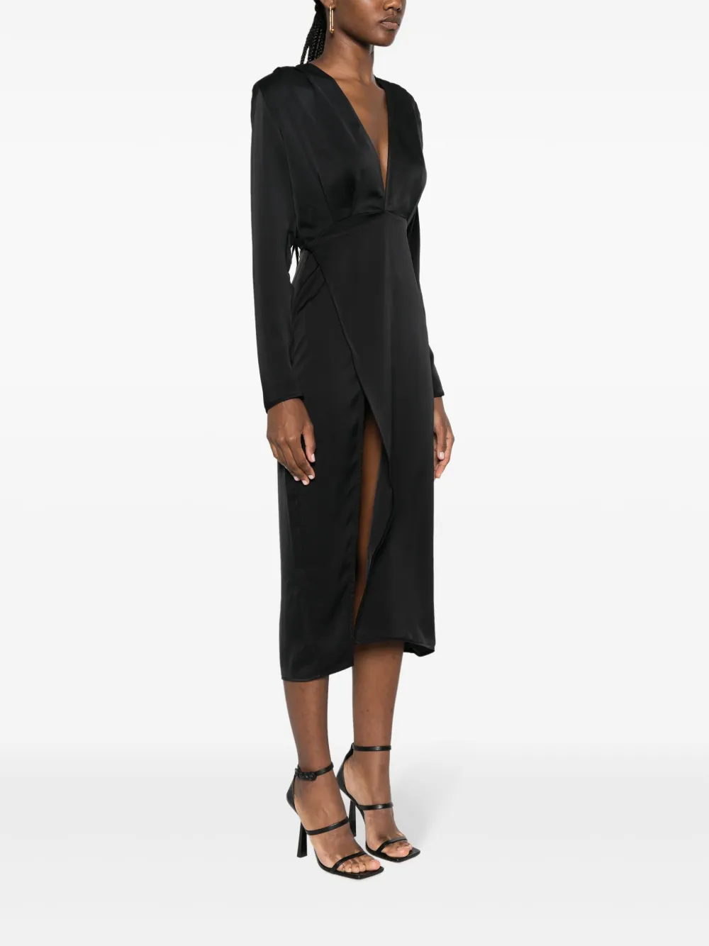 Черный, сатиновый финиш, модель на запах, дизайн со сборками, глубокий V-образный вырез, застежка на завязке сзади, длинные рукава, разрез спереди, прямой подол и длина миди.